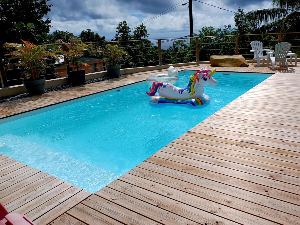 Gözəl Villa, Sainte Luce yüksəkliklərində və çimərliyə yaxın ərazidə yerləşir Buraya 2 Kondisionerli otaq (ikinəfərlik çarpayı) + paltardəyişmə otaqları daxildir + 2 hamam otağı, ayrıca hovuz (siqnalizasiya və darvaza ilə təmin olunub) Karib dənizinin və bağın 180 dərəcə panoramik mənzərəsi. Təbiətin mərkəzində yerləşən birdsong və bağdan zövq alacaqsınız. Nəzərdən yayınmır. Çimərliyə və imkanlara 5 dəq (Carrefour Express, aptek, restoran ). Tutum: 4 nəfər + 1 körpə