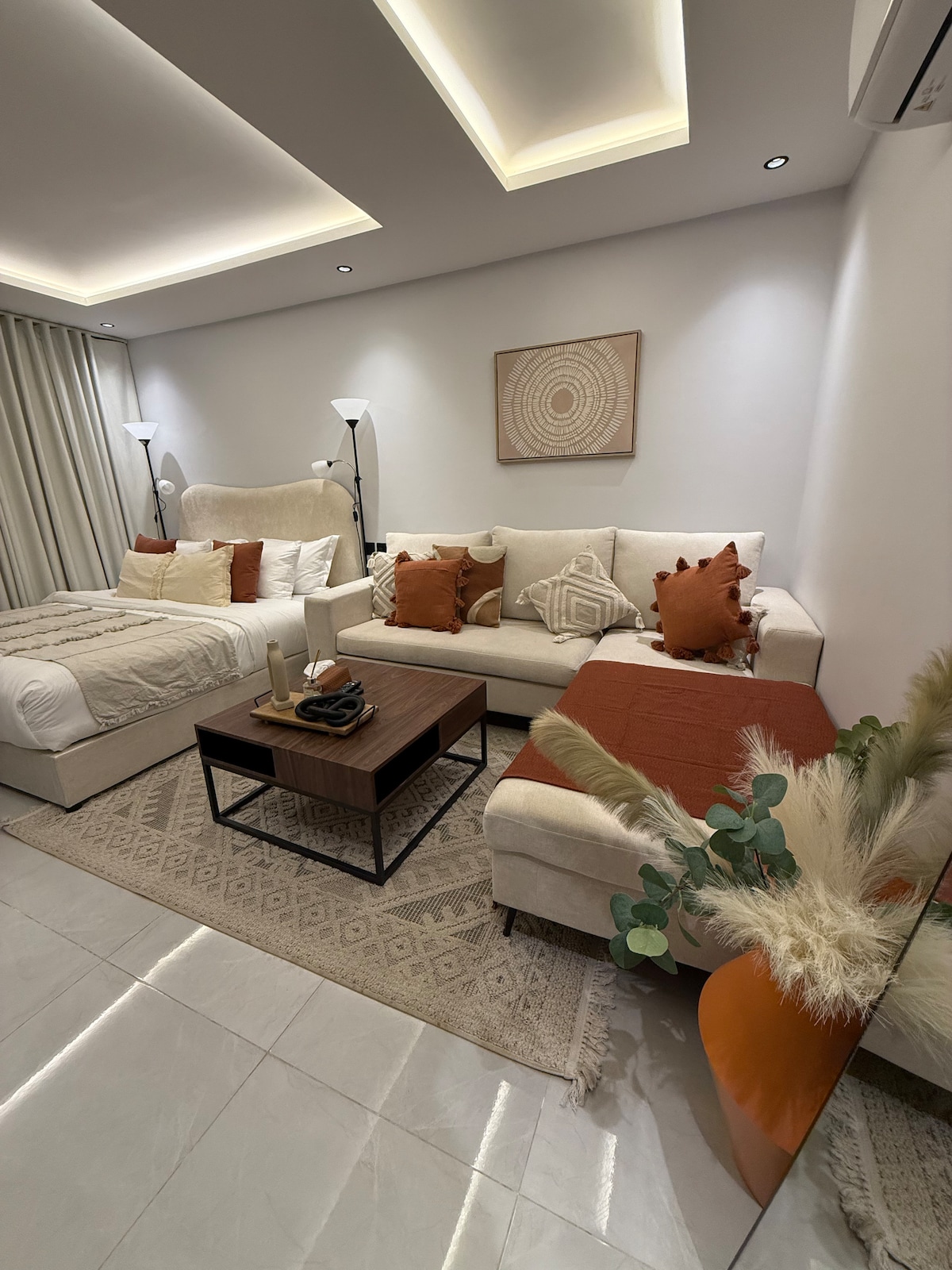 Əl Narjisdə Boho- üslubunda istirahət yeri! Yaşayış sahəsi, təchiz olunmuş mətbəxi, 2 vanna otağı və 4 nəfərlik yemək masası olan rahat 1BR mənzil. Təbii bitkilər təravət, yumşaq işıqlandırma və isti tonlar rahatladıcı ab-hava yaradır. Tək səyahətçilər, cütlüklər və ya qısamüddətli qonaqlamalar üçün mükəmməldir. Sürətli Wi-Fi, Kondisioner və parkinq daxildir. Yeni, cəlbedici məkanda rahatlıq, üslub və rahat Ər-Riyad qonaqlamasından zövq alın.