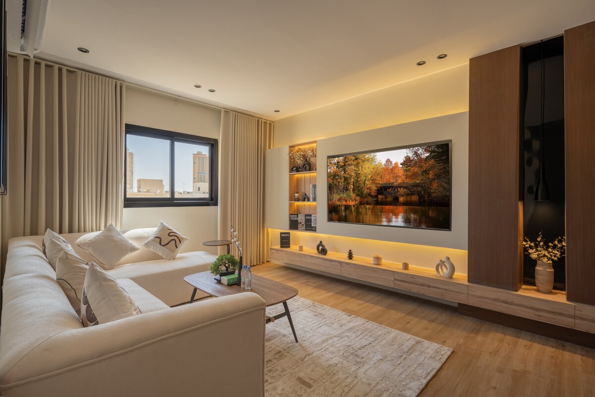 Şimali Ər-Riyadın (Əl Aqiq rayonu) mərkəzində yerləşən, ağıllı girişi olan dəbli bir otaqlı mənzil. Şəhərin ən canlı görməli yerlərinə və Ər-Riyad Mövsümü tədbirlərinə mükəmməl şəkildə yaxın məsafədə yerləşir - Bulvar Şəhəri - Qış Bağı - Riyad Park Mall - Kral Abdullah Maliyyə Rayonu (KAFD) - Solitaire Mall - Diplomatik Məhəllə (DQ) 🛋️ Mənzilin Xüsusiyyətləri: - Abunəsi olan ağıllı televizor (Netflix, Shahid, YouTube) - Limitsiz yüksək sürətli internet - Təchiz olunmuş mətbəx(soyuducu, qəhvə maşını, çaydan)