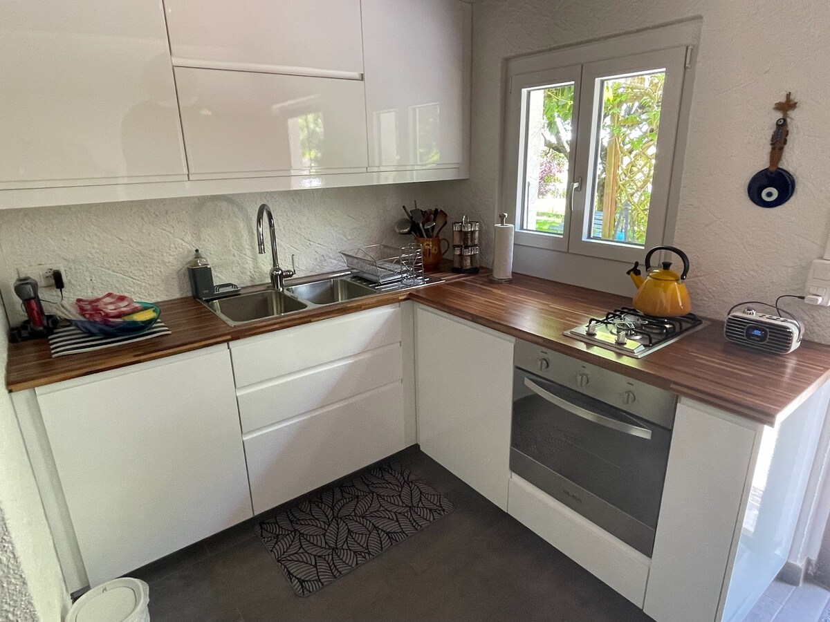 Gölə yaxın, ikinəfərlik yataq otağı, modul qonaq otağı, təchiz olunmuş mətbəx, vanna otağı, terras və bağı olan rahat 60 m² mənzil. Ayrıca, peşəkar və ya payız tətili üçün əladır. Wi-Fi, pulsuz parkinq, yaxınlıqdakı mağazalar və restoranlar. Fəaliyyətlərinizdən sonra göl kənarında və ya payız rəngləri olan üzüm bağlarında gəzinti ilə dincəlin.