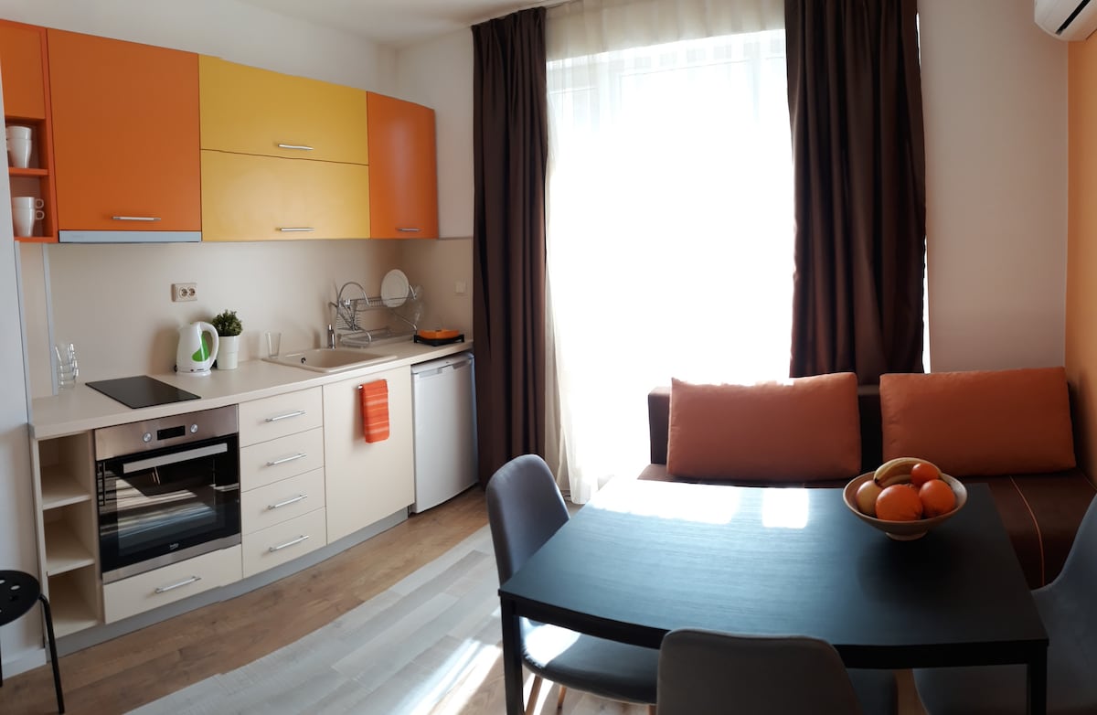 Апартаментът разполага с две уютни спални за спокоен сън. Светъл хол с напълно оборудван кухненски бокс (имате всичко необходимо, за да се почувствате като у дома си). Комфортен разтегателен диван за допълнителни гости. Чиста и модерна баня с тоалетна. ✅ Пълно оборудване: Ел. уреди, бърз Wi-Fi, климатизация. 🚫 Без домашни любимци – гарантираме хигиена и спокойствие за алергичните ни гости.