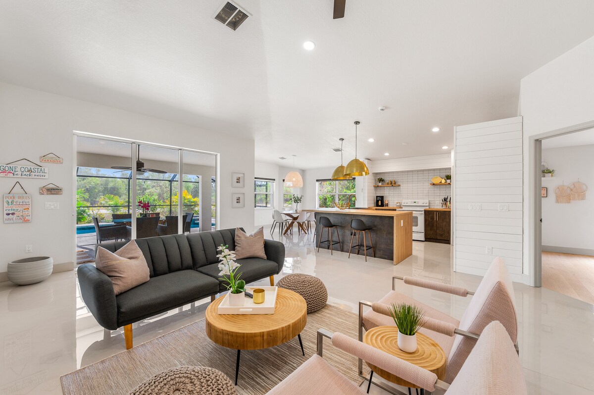 A little bit of vintage a little bit of modern . A whole lotta Florida LOVE Free High speed wifi 1 gig 2 dedicated work stations (1 with ethernet). Coffee Station with a Keurig hot/ iced coffee option and a regular drip coffee pot Free washer/dryer Currently we have a screened in Lanai with 2 Adirondack chairs and a small L shaped sectional . The backyard is not fenced in . Beautiful new home abundant wildlife /fishing/boating/golfing In the area .As well as several sandy beaches nearby.