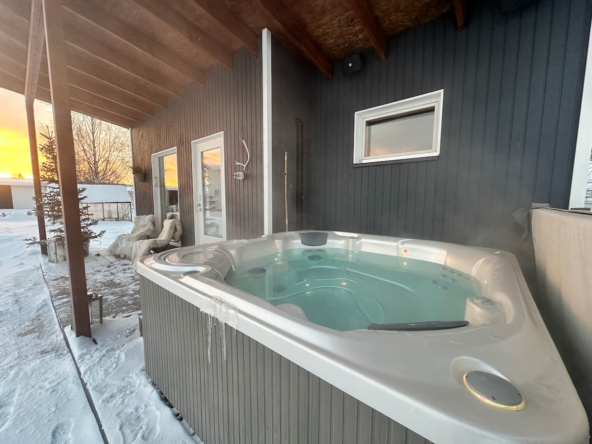 Tunnelmallinen mökki kylpytynnyrillä ja saunalla