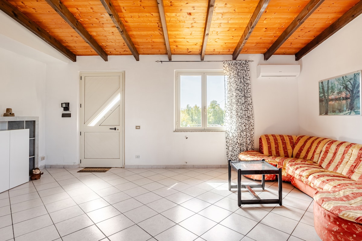 Mənzil villanın 2-ci mərtəbəsində yerləşir, tam təchiz edilmiş, rahat və işıqlıdır və ikinəfərlik yataq otağı, duş, mətbəx, camaşırxana, terras və balkonlu hamam otağından ibarətdir. Biz Simaxisdə (OR) Oristanodan 7 km, qovşaqdan S.S. 131-ə 5 km məsafədə yerləşirik. Oristanese-nin gözəl sahillərinə çatmaq asandır, 25-30 dəqiqə uzaqlıqda Sinisin Is Aruttas, San Giovanni di Sinis, S'Archittu, Mari Ermi, Torre Grande kimi gözəl və vəhşi çimərliklərini görürük
