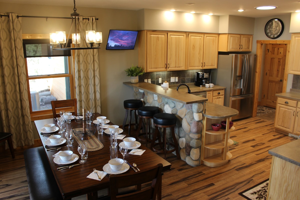 ●Some new recent additions ● *Luxurious Hot Springs Hot Tub* ~~~~~~3 Patio Heaters~~~~~~ ◇Complete Outdoor Kitchen◇ *Two pizza ovens 9 Assorted Snow Sleds Cabin decked out with game tables, a bar, breakfast bar, kitchen with all the amenities, 5 televisions (including a big screen 75"). *There is a large deck *Covered Pavilion *Wood Fire Pit *Gas Fire Pit * two Patio Heaters . Plenty of firewood and LP gas provided. Enjoy the outside even when it's a bit cold. Chippewa River access...