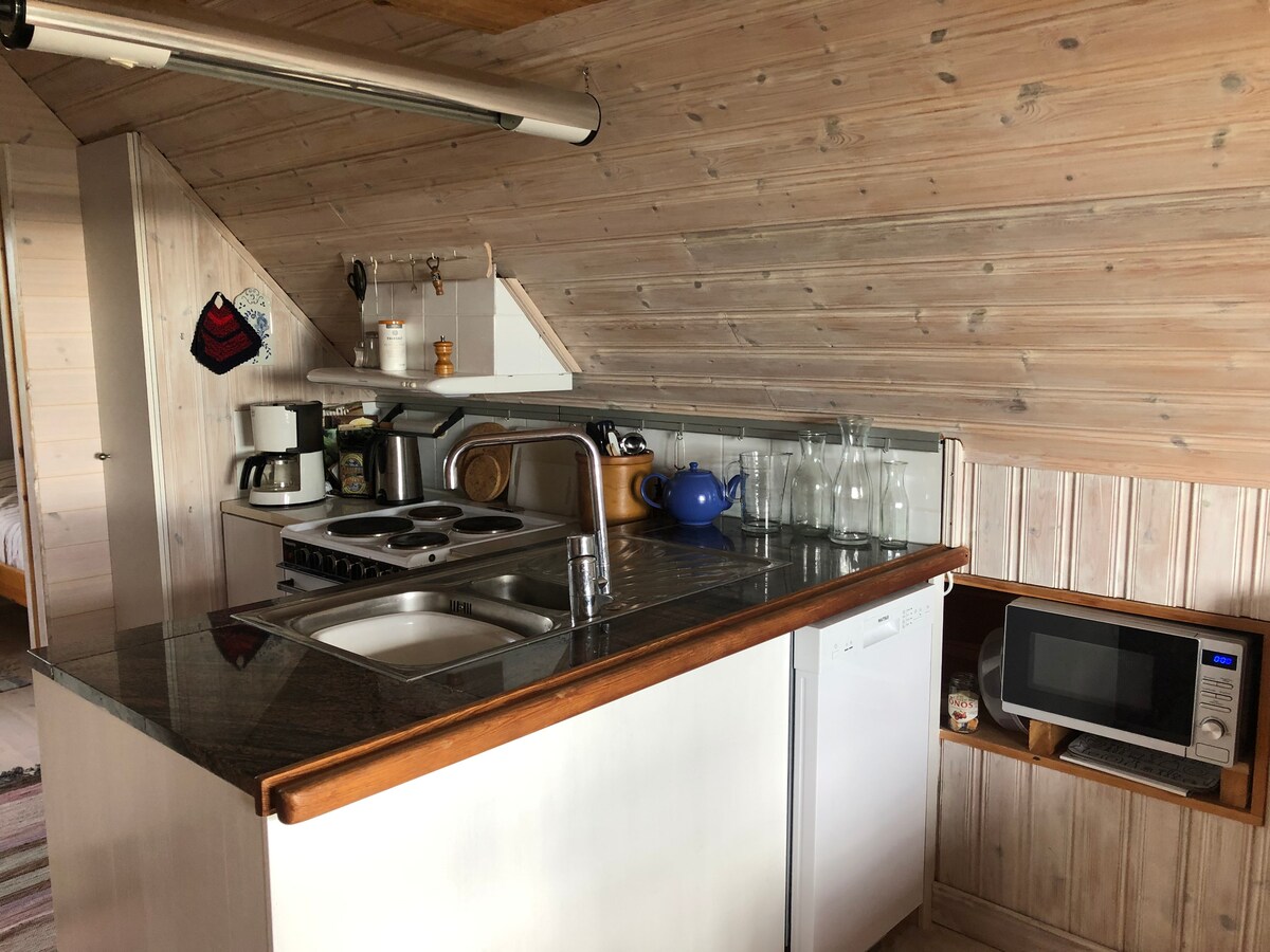 Huset är fristående byggnad och har ett stort öppet allrum på bottenvåningen med soffgrupp framför stora glasdörrar mot en hänförande utsikt över havet och fiskeläget Jauvika. I bottenvåningen finns en sovdel med dubbelsäng. På övervåningen finns kök, matplats, ett litet sovrum med två enkelsängar, toalett och dusch. Är det lugnt väder sitter man ute mot havet och vid blåst är det lugnt på den skyddade innergården med egen trädgårdsmöbel. Huset har WiFi, TV med många kanaler och luftvärmepump.
