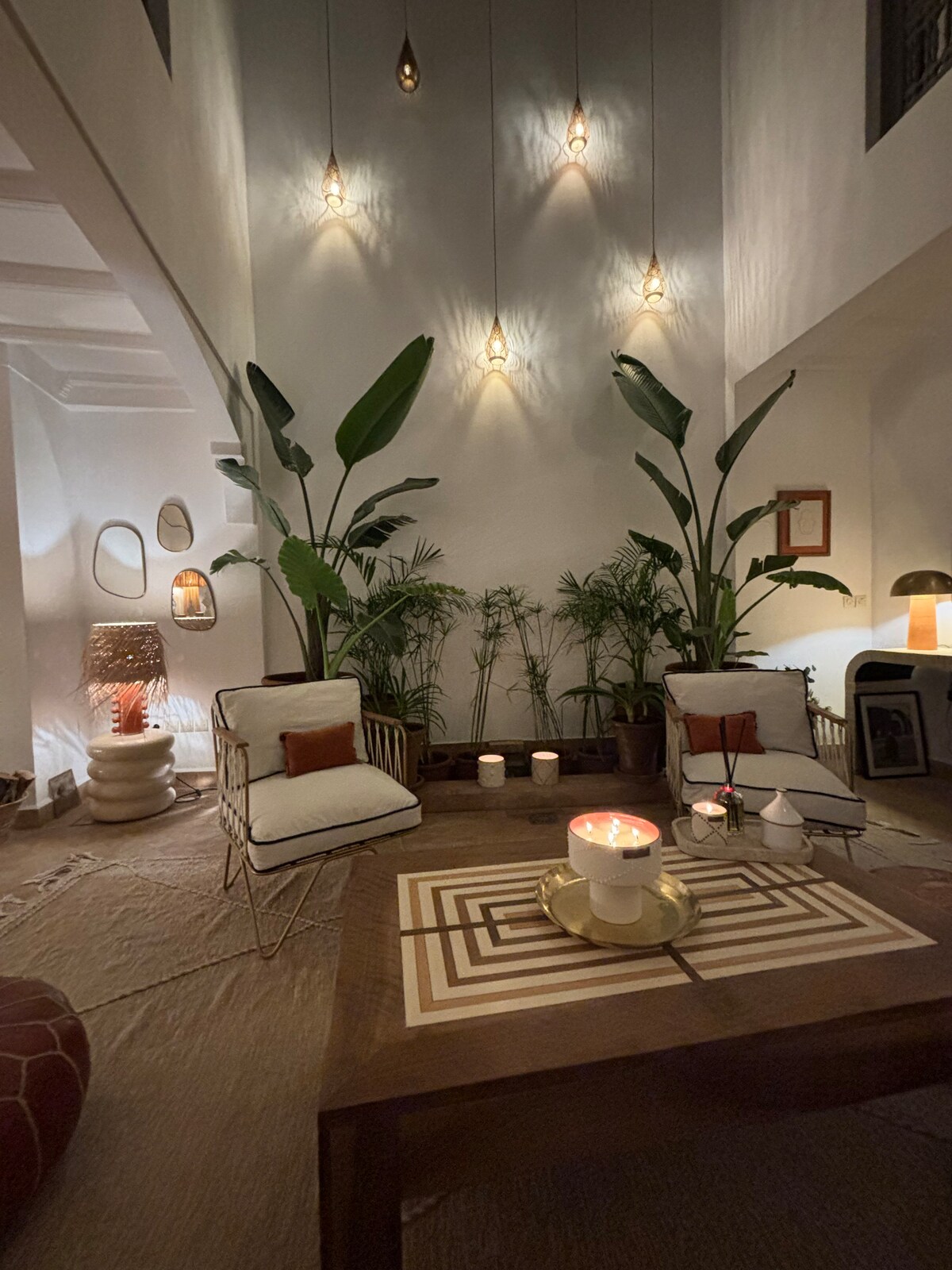 ✨ Stay in our authentic 3-level Riad (80 m²) in the heart of Marrakech. Enjoy a charming patio with fountain, kitchen, dining area, small lounge, guest bathroom, and a bedroom with en-suite on the ground floor. ✨ Upstairs, relax in a second bedroom with private bathroom, plus a reading & TV corner. ✨ End your day on the rooftop terrace, arranged as a summer lounge perfect for sunbathing or magical evenings under the stars. ✨ Comfort, tradition, and Moroccan hospitality await you