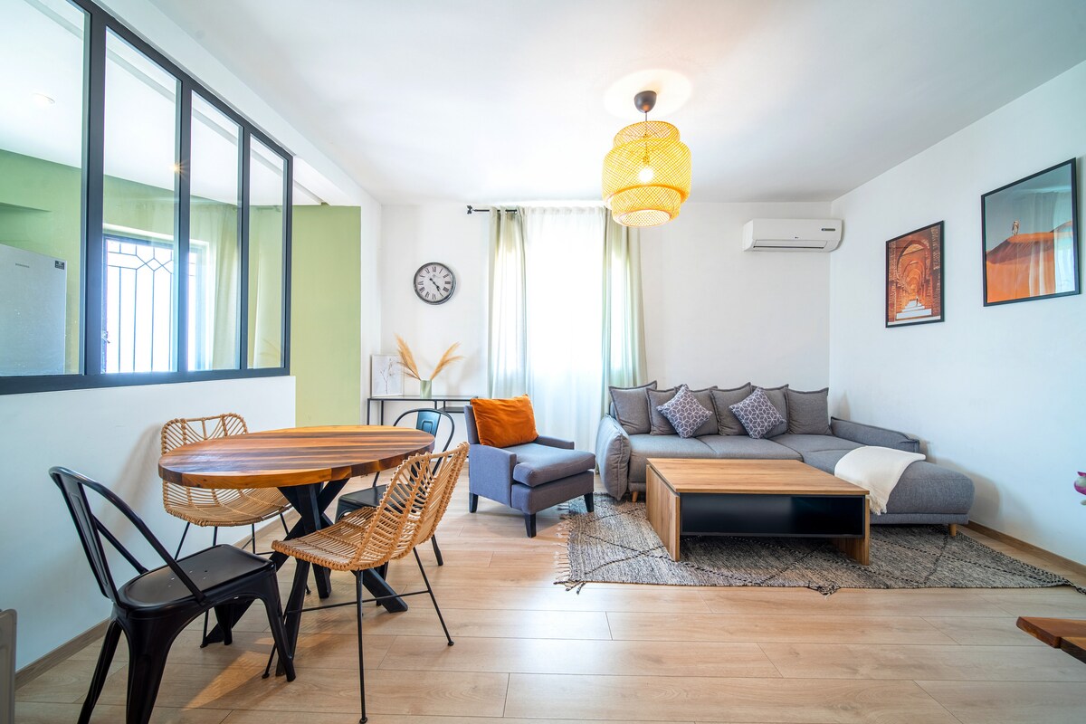 Séjournez en plein cœur de Marrakech dans notre appartement 2 chambres et 2 salles de bain. Profitez d'une literie Simmons haut de gamme, WiFi haut débit (fibre optique) et d'une décoration moderne avec une touche ethnique. Cuisine entièrement équipée, baignoire élégante, et douche italienne. À quelques pas de la place Jemaa el-Fna, du Plazza, et du Carré Eden. NB : Les couples marocains non mariés ne sont pas autorisés.