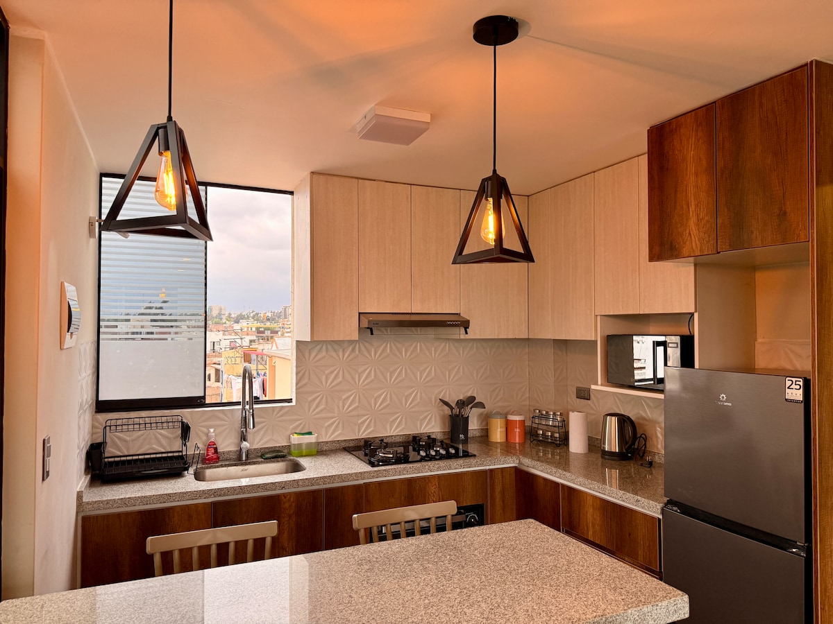 Relax in this quiet and elegant space. You will have the best Arequipa sunset from a charming balcony, in the most exclusive area of Cayma district. We invite you to visit this cozy mini apartment located in a private condominium with elevator, three blocks from the Plaza of Cayma and the best shopping centers, malls, banks and restaurants in the city. We have Netflix for free !