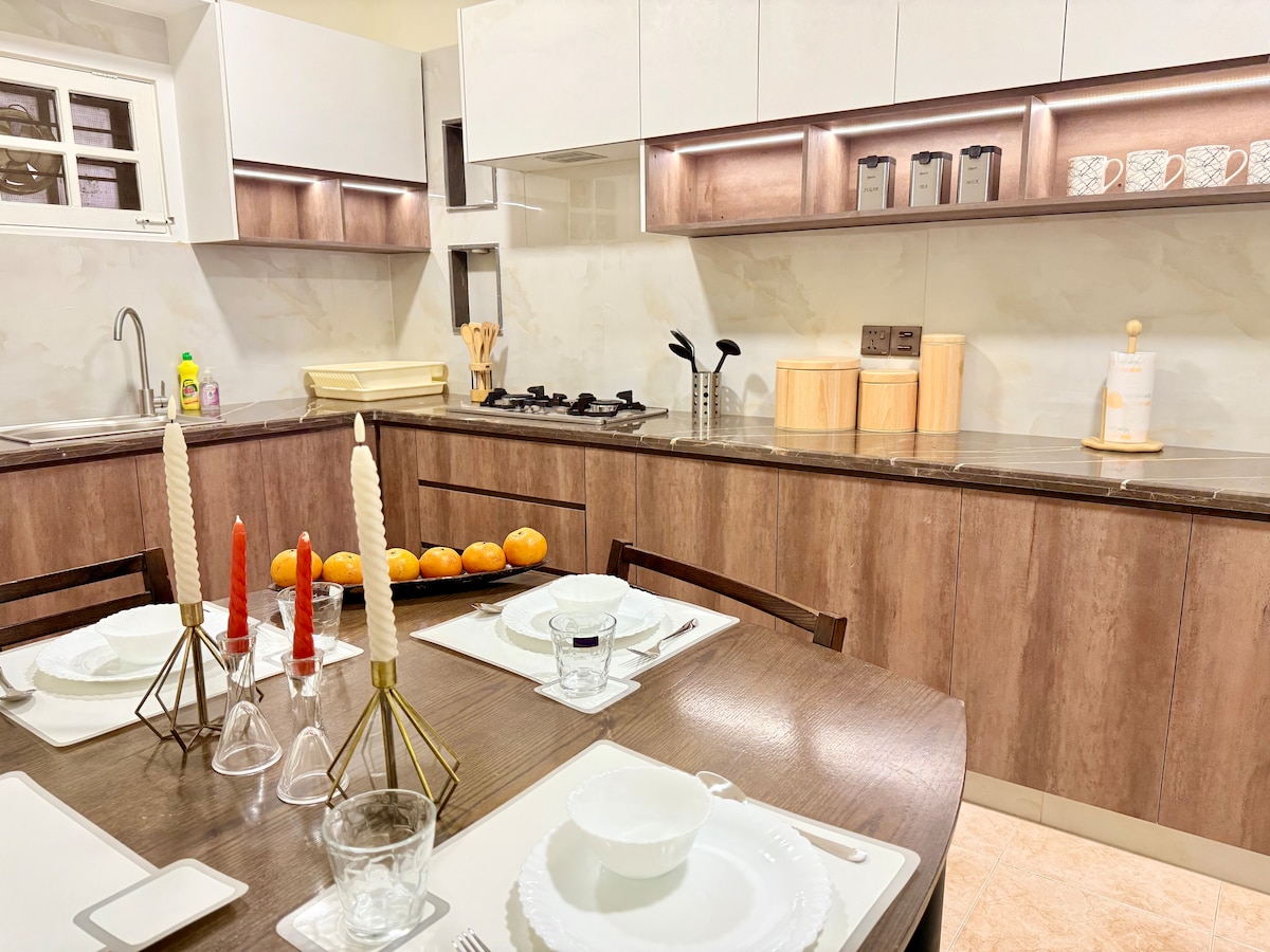 Welcome to Sapphire Suite – your cozy escape with a touch of luxury. Designed with midnight blue walls and elegant white furniture, this space offers a calm and stylish atmosphere. Enjoy movie nights with the projector, unwind in the chic living area. The suite also features a fully equipped kitchen, modern bathroom, and high-speed Wi-Fi. With 24/7 caretaker support and security, it’s perfect for families, couples, or business travelers looking for comfort and style in DHA.