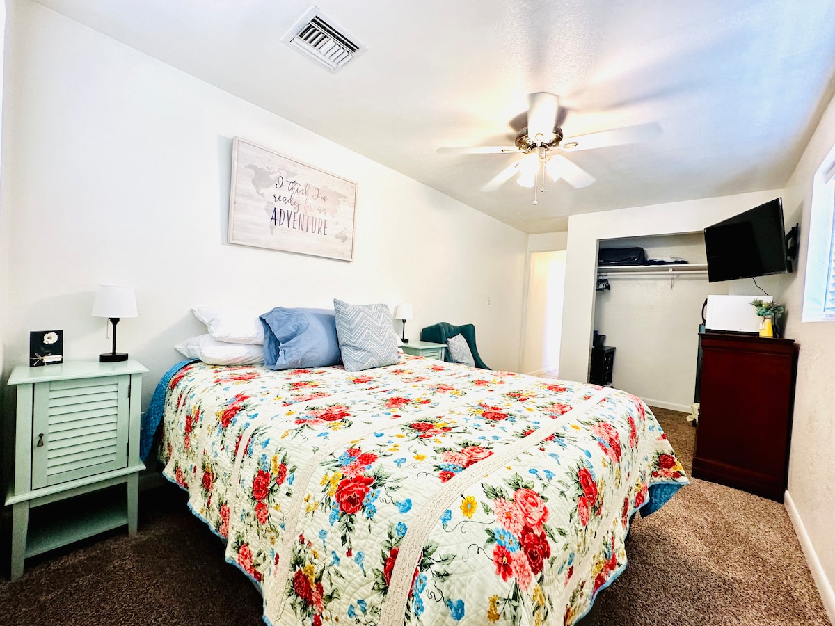 Saffordda füsunkar, mərkəzdə yerləşən kottec! Qranit piştaxtaları, yenilənmiş hamam otağı və təzə döşəməsi olan yenidən qurulmuş mətbəxdən zövq alın. Rahat qonaq otağında 70" televizorla dincəlin və ya meyvə ağacları, skamyalar və manqal ilə geniş həyətdə dincəlin. Kottecdə böyük ölçülü çarpayı, iki tam ölçülü çarpayı, əlavə yataq yeri üçün hava döşəyi və tamamilə yeni yataq otağı mebeli var. Kiçik idman zalı, geniş parkinq və məxfilik üçün hasarlanmış həyəti olan bu yer Saffordda rahat istirahət yeridir