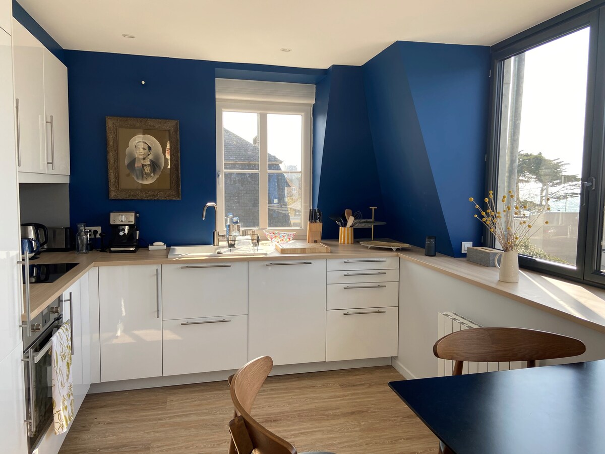 ● Dernier étage au calme (sans ascenseur). Terrasse Sud & balcon Ouest. ●Idéal pour rayonner en Bretagne (Gares à 700 m). ● Parking privé juste devant la porte. ● Arrivée flexible : Entrée autonome à l'heure qui vous convient. ● Confort : Lits faits à l'arrivée & linge fourni. Grande pièce de vie de 41m² très lumineuse. ● Accueil : Café, thé, beurre, confiture à disposition. ● Équipements : Wifi Fibre, cuisine. ● Quartier de Robien : commerces & calme à deux pas du centre-ville.0
