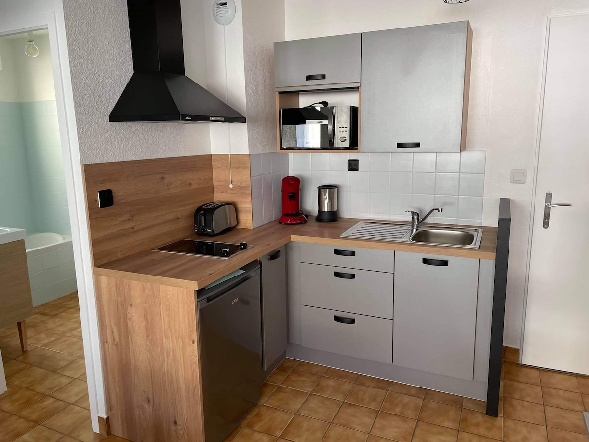 Yataq dəsti təmin edilmiş bir yataq otağı, avadanlıqla təchiz olunmuş mətbəxli qonaq otağı, 2 uşaq və ya 1 böyük üçün yer olan 120 sm enli divan-çarpayı, hamam, tualet və terrasdan ibarət kiçik mənzil, sakit yaşayış yeri, şəxsi parkinq. Yaxınlıqda çimərlik və GR34, dəniz gəzintiniz və ya yeməyiniz üçün liman və hər növ mağaza, kinoteatr və kazino... Sorğu və mövcudluq əsasında gecəlik seçim Sorğu əsasında xüsusi təklif: 3 həftə 10% və 1 ay 15%