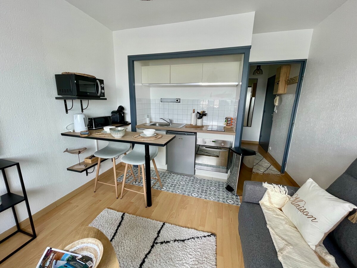 YATAQ DƏSTİ, DƏSMALLAR VƏ ÇAY DƏSMALLARI TƏMİN EDİLİR. 25 m2 yenilənmiş bu parlaq ** studiya iqamətgahın birinci mərtəbəsində yerləşir, cənuba baxan 10 m2 terrası var, 2 nəfər üçün idealdır, 3 nəfəri qəbul edə bilər, lakin daha az rahat olacaqsınız. Tam təchiz olunmuş mətbəxdən ibarətdir Qonaq otağında iki konvertasiya edilə bilən sürətli divan 160 x 200 və 140 x 190, televizor lcd 82sm, eləcə də saxlama Duş və tualeti olan vanna otağı