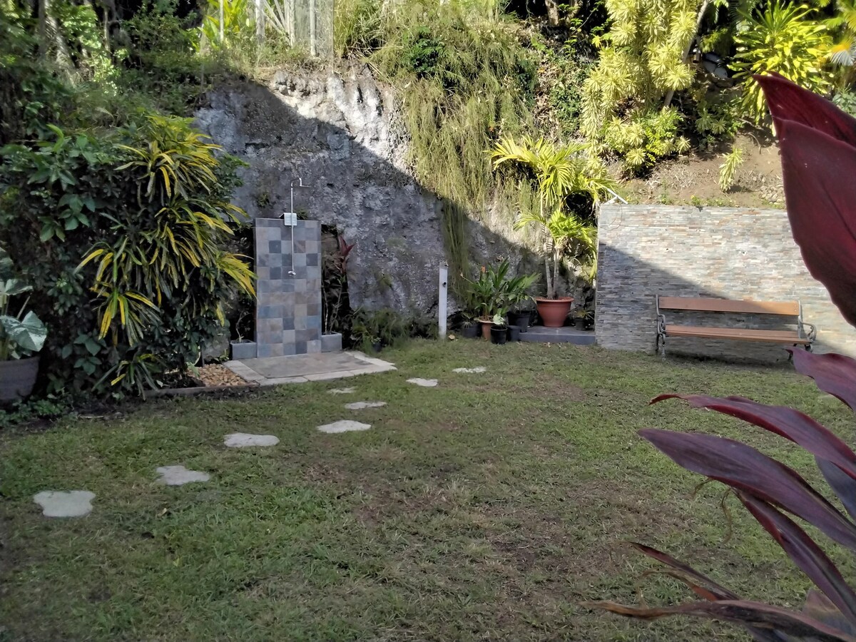 Studio cosy de 15m² en rez-de-jardin, niché entre mer et montagne dans un jardin tropical de 1400 m² avec bassin, piscine réservée exclusivement aux voyageurs du studio, salon extérieur et espace barbecue. Idéal pour se détendre après une journée de découverte. À 1h de l’aéroport, 20 min de l’embarcadère pour Les Saintes, 15 min de la Soufrière, à proximité des cascades, rivières, sentiers de randonnées et commodités. Un cadre parfait pour se ressourcer et profiter de la nature.