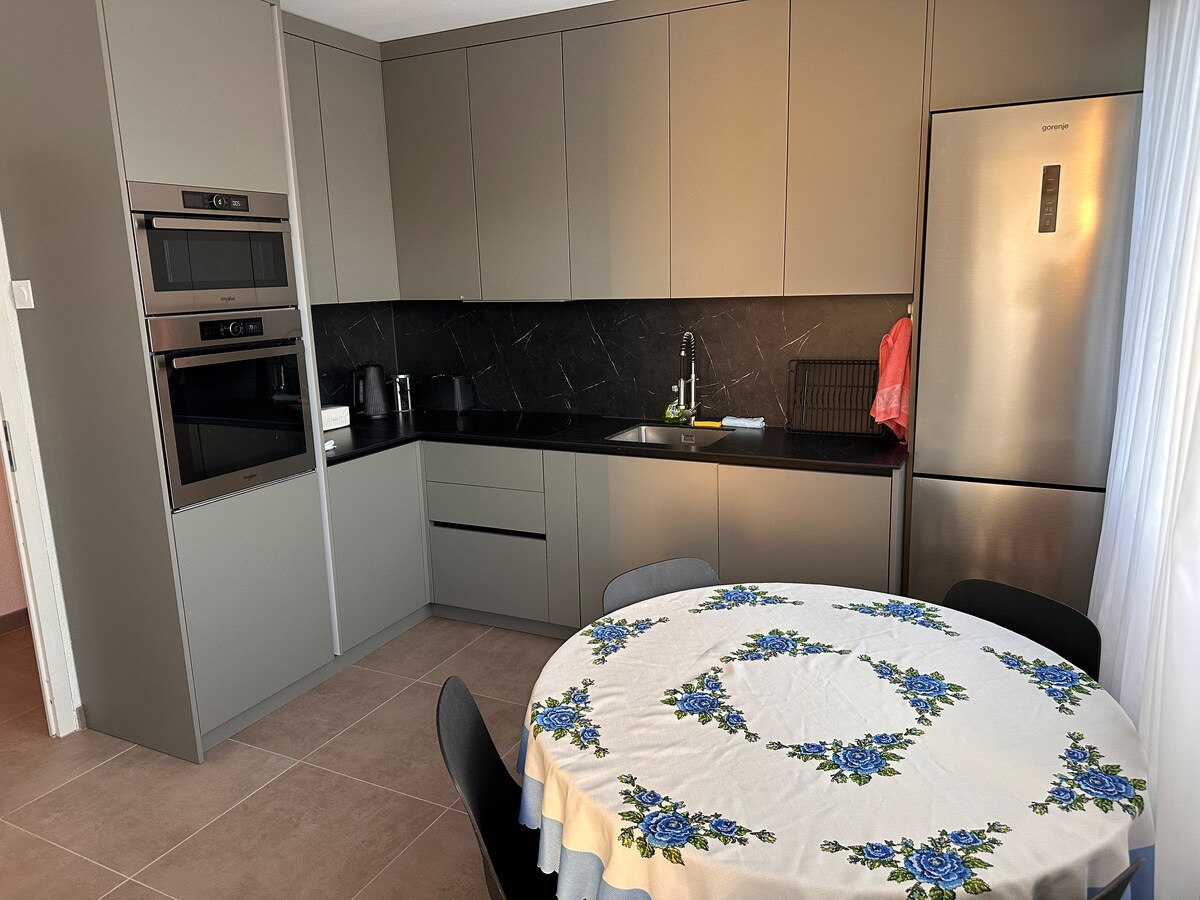 Geniş qonaq otağı və təchiz olunmuş mətbəxi, vanna otağı (italyan yağış duşu), ərazidə mövcud olan bir neçə yeri olan pulsuz parkinqi (elektrikli avtomobilləri doldurmaq imkanı) olan mükəmməl yeni və kondisionerli 3 yataq otaqlı mənzil. Tam və sakit şəraitdə yerləşir. Bütün otaqlarda göl mənzərəsi və göyərtəyə birbaşa giriş var. Magistral yola yaxın, Veveyə 10 dəq, Montreuxa isə 15 dəq.