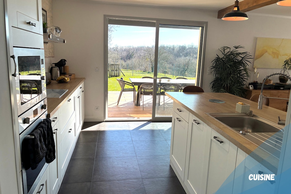 1500m2 ərazidə ürəklə tikdiyim evimə xoş gəlmisiniz. Konyakdan 5 dəqiqəlik məsafədə Rikhemont adlanan çox sakit kiçik bir kənddə yerləşir. Batareyalarınızı enerji ilə doldurmaq üçün meşənin möhtəşəm mənzərəsindən zövq alacaqsınız. O, 9 böyük yerləşdirə bilər