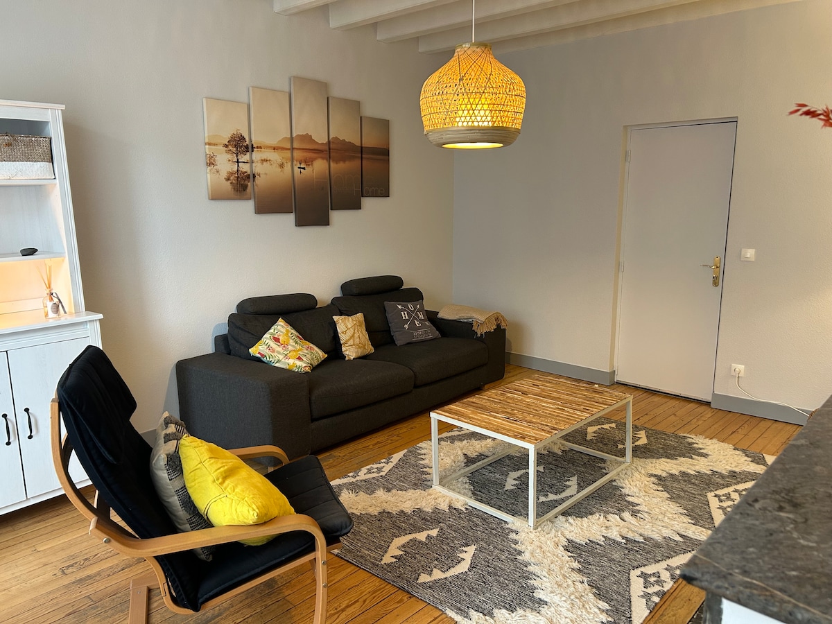 This charming, LOFT quiet 43m² loft awaits you Perfect for business travelers, couples, or solo Independent entrance adjoining our home Upstairs bedroom, large shower room WC, new size 160 bed, mini dressing room on the ground floor with equipped kitchen BED 120 Very quiet nights Private parking Professional vehicles and motorcycles Bicycle garage possible. Quiet private outdoor garden table Panorama Restore the premises!!! and we will do cleaning disinfection ventilation cleaning washing