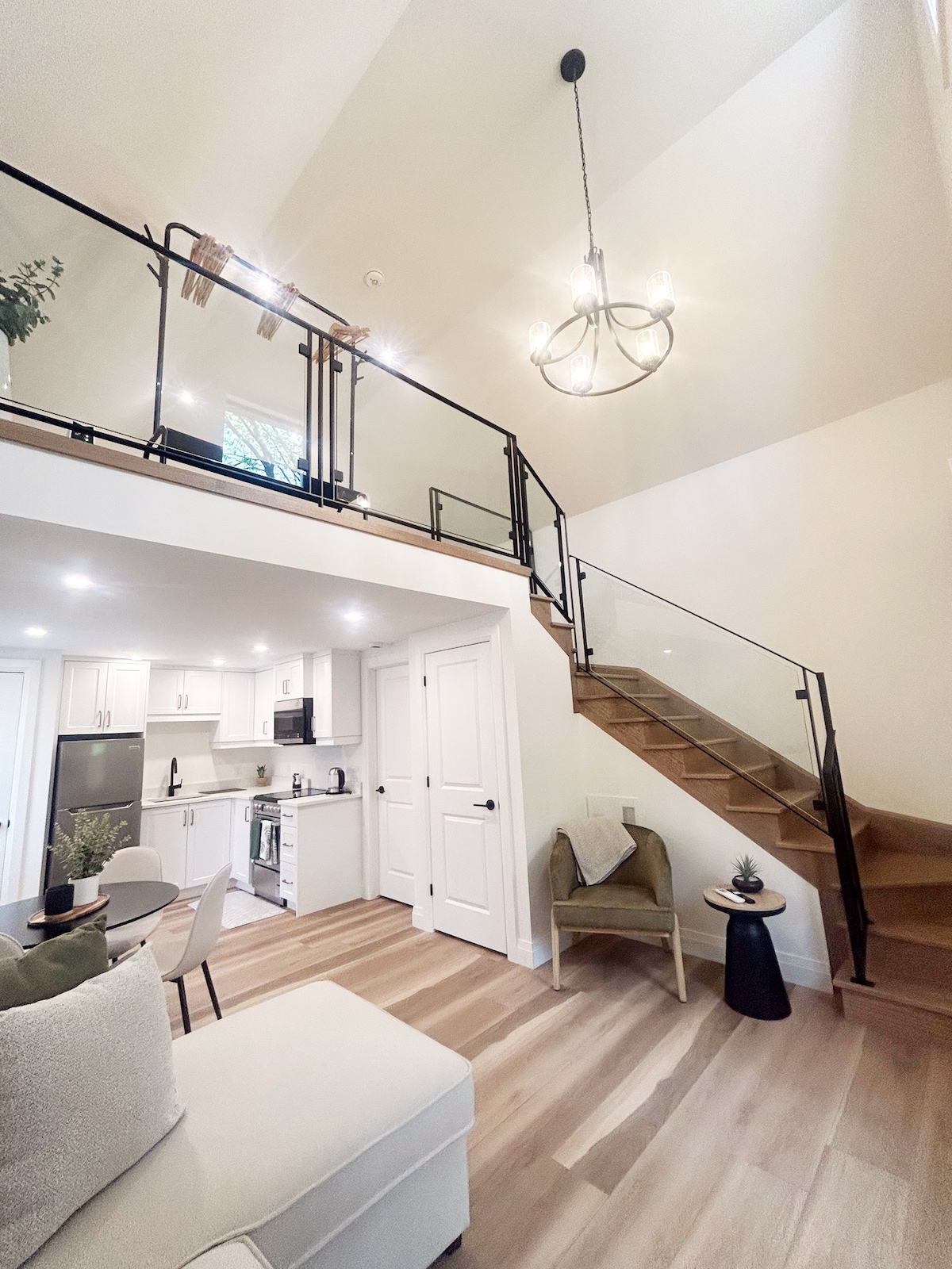 Chic King Suite at Bradshaw Lofts: The Clairemont. Discover the fusion of modern luxury and timeless design in our King suite. With a sumptuous King bed, Queen pull-out, Netflix, and a fully-equipped kitchen, comfort meets style. Just a stroll from downtown Stratford's dining and shops, and close to the Stratford Festival theatres. Experience unparalleled elegance at The Clairemont
