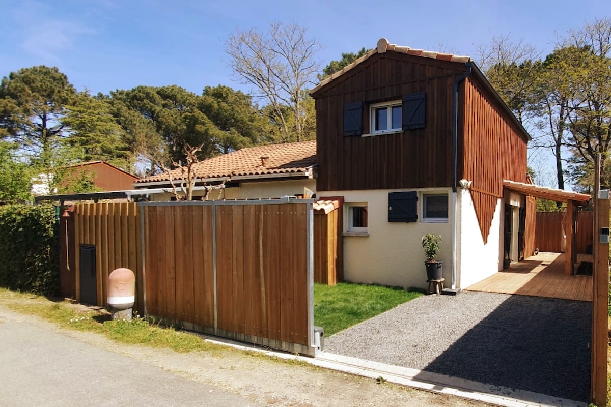 C est une maison en bois de 90m2 plein sud sur un terrain de 600m2 ... au calme sans vis à vis avec 2 belles chambres ... une chambre avec lit queen size et l autre avec un lit superposé … une salle de bain avec douche italienne et une baignoire ; elle se situe près des ports et des commerces , à 8km d Arcachon et 20 min de l'océan. Maison tout confort avec plancha , lave vaisselle et lave linge . Draps et serviettes fournis Place de parking gratuite et sécurisée Trampoline en place