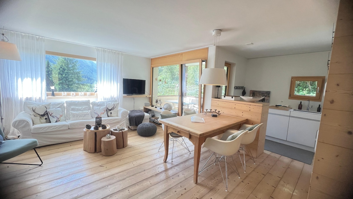 Die Wohnung ist eine absolute Wohlfühloase. Der Blick direkt in die Berge und in die Natur ist wunderschön. Viel Holz und edle Materialien machen die Wohnung zu einem Bijou. Holzböden, ein Schwedenofen, 2 Doppelschlafzimmer mit Boxspringbetten (1 x 1.80 m, 1 x 1.60 m), 2 Badezimmer 1 x mit Dusche WC, 1 x mit Bad/Dusche/WC. Küche mit Induktionsherd, Nespresso Maschine und vieles mehr gehören zum Standard. Der eigene Parkplatz verfügt über eine Ladestation für E Autos (kostenpflichtig).