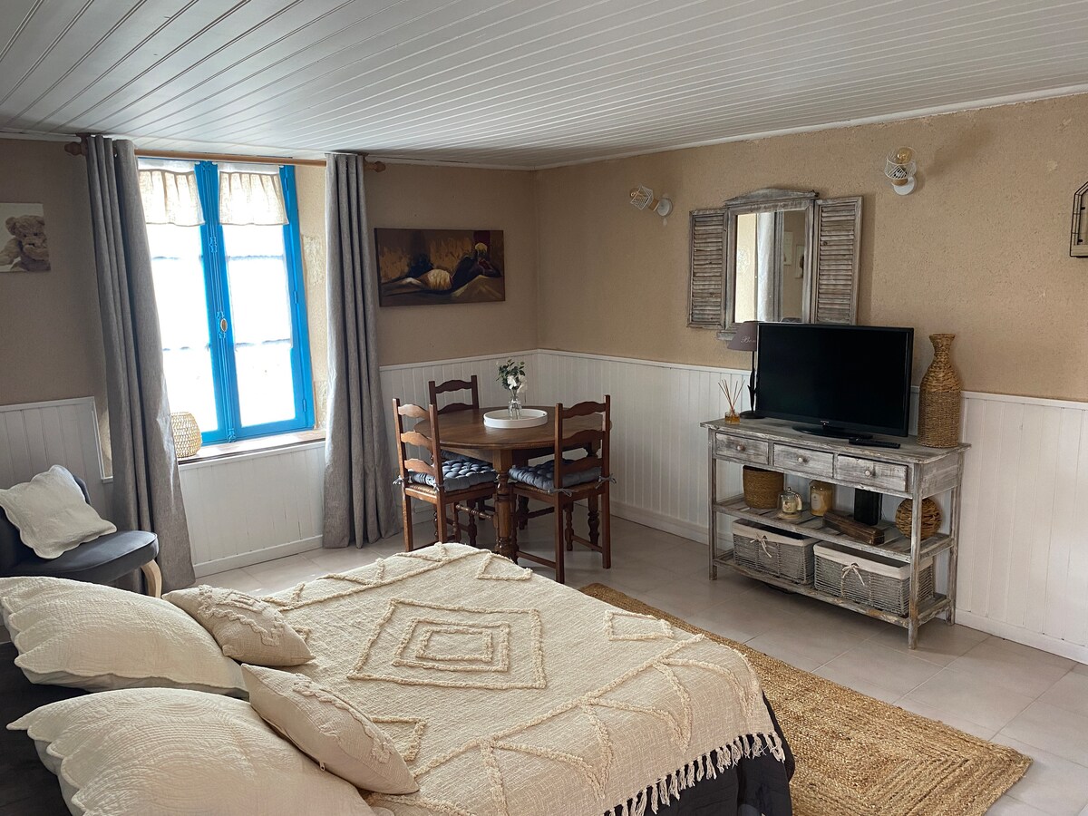1 yataq otağı (1 çarpayı 140 x 190), divan çarpayısı olan qonaq otağı (2 nəfər) və təchiz olunmuş mətbəx sahəsi (soba, mikrodalğalı soba, qabyuyan maşın), kombinə edilmiş soyuducu/dondurucu, duş otağı-WC (paltaryuyan maşın), televizor, pulsuz Wi-Fi olan gözəl kiçik təmirli birmərtəbəli tətil evi. Elektrik istilik sistemi daxildir/odun sobası. Lazım gələrsə, velosiped saxlamaq üçün bağça anbarı. Evə bitişik kiçik terras; kömür barbeküsü üçün böyük bağlı bağ. Təhlükəsizlik depoziti: 200 €