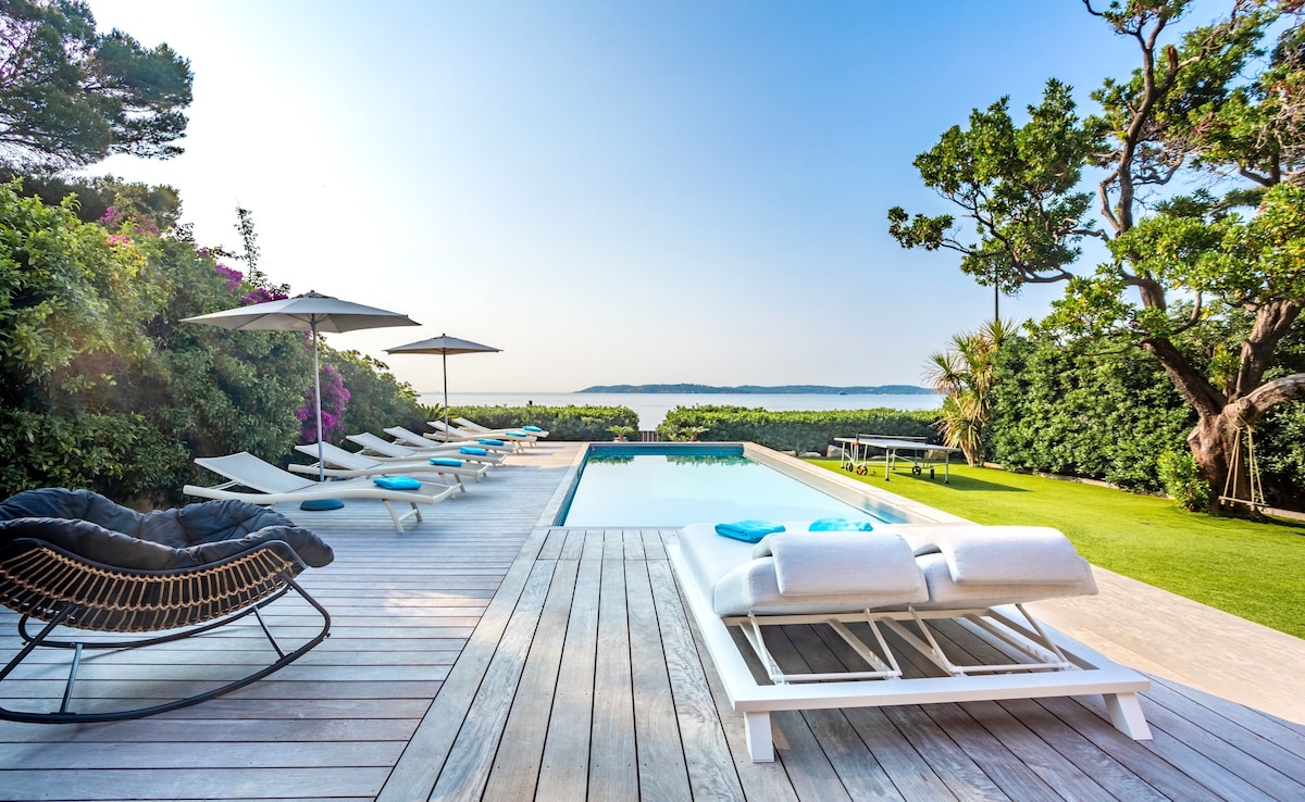 RARE IN SAINTE-MAXIME: Villa NEAR THE CENTER, SEASIDE. Heated pool on request. PANORAMIC SEA VIEWS. Recently renovated 160 m² villa. + 1,000 m² of land. Garden, ping-pong table, BBQ, parking, A/C, TV and WIFI... 5 bedrooms (quiet, quality bedding) + 2 bathrooms. A 5-minute walk from the center of Sainte-Maxime and 5 minutes from the beaches. Access to the seafront for beautiful walks and swimming. Services included: end-of-stay cleaning, household and pool linens.