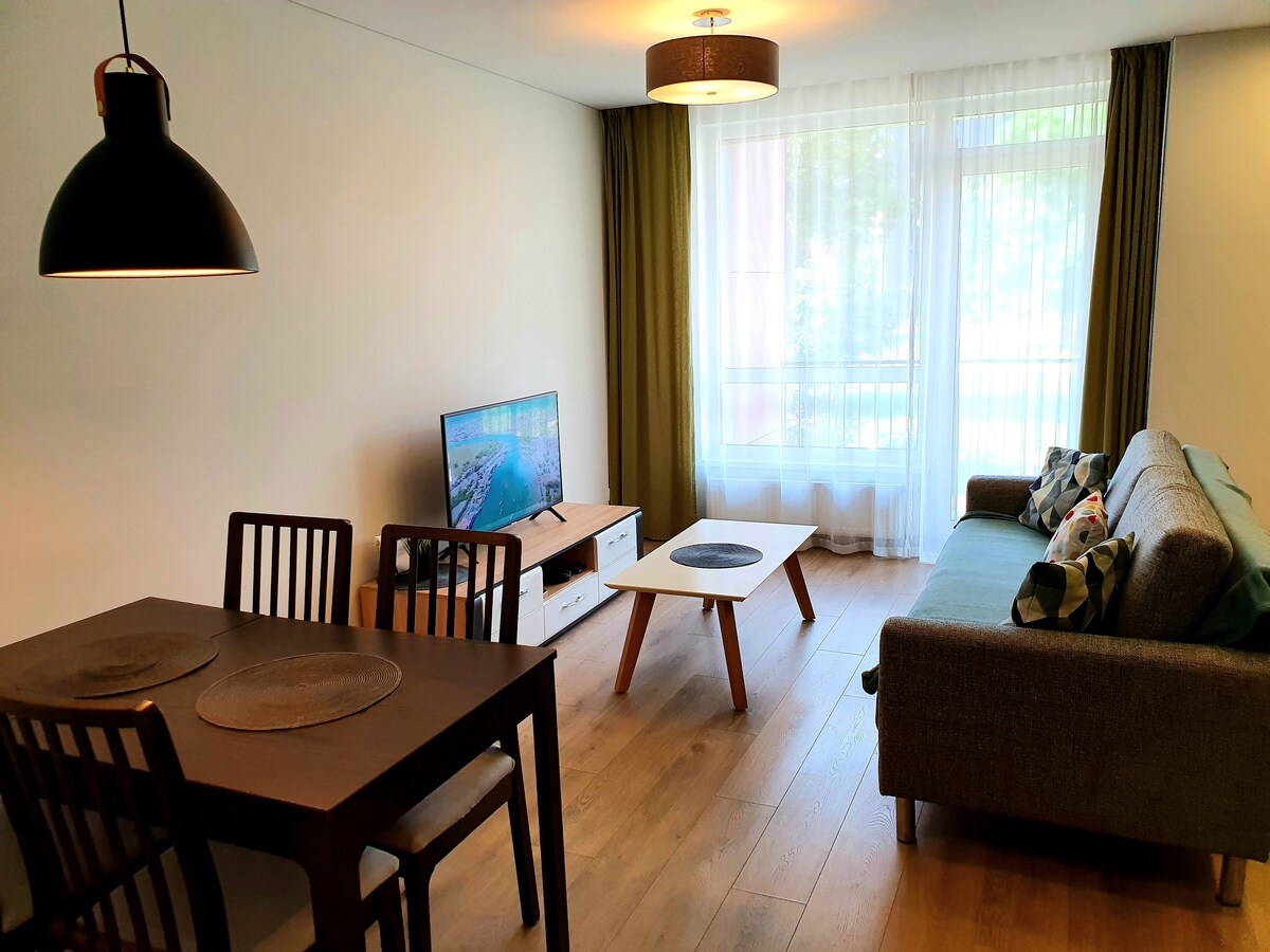 Mənzilin sahəsi 48 kvadratmetrdir. Onun tərtibatı cütlük və ya kiçik ailənin ehtiyaclarına uyğun olaraq gözəl şəkildə uyğunlaşdırılıb. Siz ikinəfərlik çarpayısı olan rahat yataq otağı, 1 əlavə qonaq üçün divan çarpayısı olan gözəl bir qonaq otağı, tam təchiz olunmuş mətbəx və vanna otağı tapacaqsınız. Yüksək sürətli WiFi və televizor, saç feni, dəsmallar və yataq örtükləri təmin edilir. Buss və dəmir yolu vağzalına qısa məsafə və İçərişəhərə piyada məsafə (12-17 dəq). Vilnüs hava limanı cəmi 3 km məsafədədir.