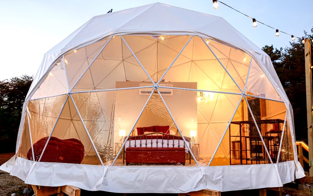 Glamping: where luxury meets the outdoors. This geodesic structure offers a rare opportunity to experience the outdoors without the elements. Complete with kitchen, AC & heat, dual control heated mattress pad, fully functioning bathroom, and sunrise views over the pasture. Whether you are looking to relax and enjoy feeding the farm animals, have an adventure riding the zip line, or indulge in a romantic evening sipping wine in the hot tub under the stars, you will leave with lasting memories.