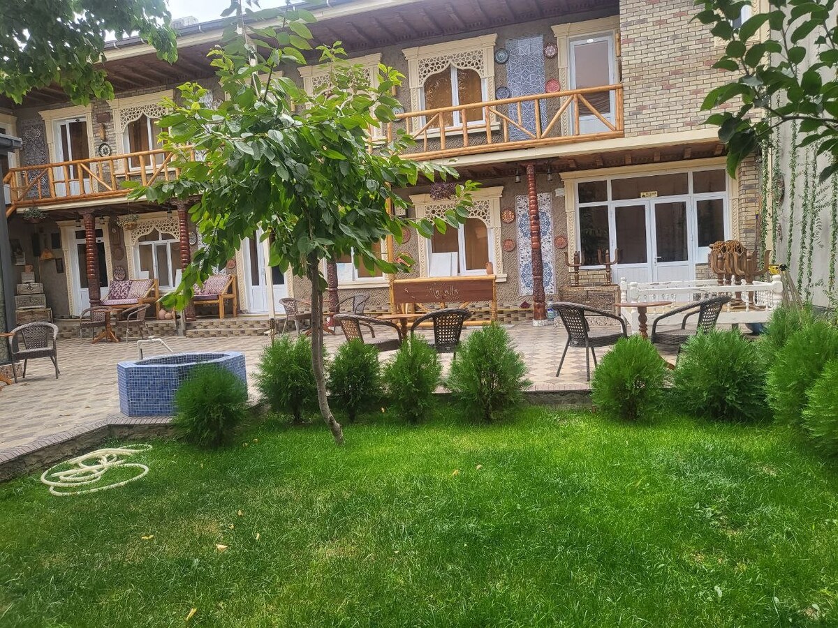 Təbii şəraitdə yerləşir. Səmərqənddən 45-60 dəqiqəlik məsafədədir. Binanın ərazisində 2 kabinə və öz saunası olan geniş duş otağı var (fin saunası və özbək hamamı qarışığı). Quşların səsi ilə oyanın və böyük yaşıl bağa baxın. 1. Mətbəxi olan kiçik 2 yataq otağı olan ev 2. Yataq otağı kabinəsi + digər qonaqların yata biləcəyi geniş qonaq otağı və terras. İstəsəniz, kiçik əlavə haqq üçün: • Avtomobil və ya şəxsi sürücü icarəsi xidməti • Ekoloji cəhətdən təmiz qida çatdırılması və aşpazlıq