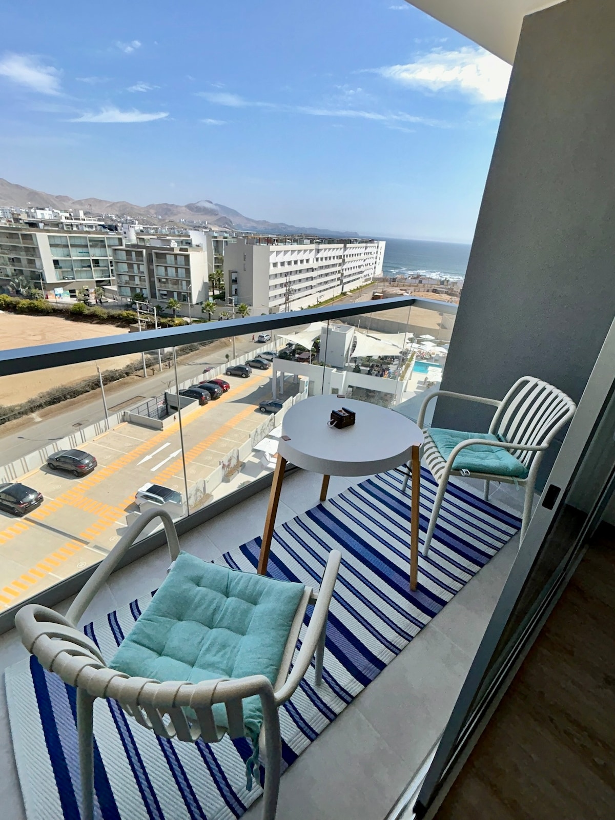 Departamento de nuevo con vista al mar, a 5 cuadras de la playa. Cuenta con 2 piscinas , área de parrillas , cancha de fútbol , básquet juegos para niños e ingresos para personas con discapacidad , si buscas celebrar tu cumpleaños , una escapada romántica, o estar con la familia este es tu lugar, disfruta del nuevo mall Punta Mar a solo 5 minutos y el centro comercial KM 40 con variedad de tiendas como Wong y el Gimnasio Smart Fit , además de variedad de discotecas.