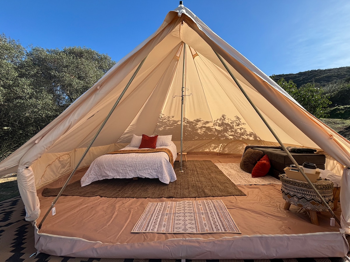 Sakit Palomar dağında xüsusi qlempinq çadırınıza xoş gəlmisiniz! 67 hektarlıq rançoda 3,600-də bu geniş zəng çadırına kraliça çarpayısı və cütlüklər, ailələr və ya dostlar üçün mükəmməl ikiqat qatlanan divan daxildir. Palıd ağacları, ulduzlu səma və dağ havası ilə əhatə olunaraq rahatlıqdan və təbiətdən zövq alacaqsınız. Qab-qacaq, soba və propan qızdırıcısı ilə hazır düşərgə paketimizə yüksəlmək seçimi olan əsl "qablaşdırın, hazırlayın" sərgüzəşti. Düşərgə üzrə Ev Sahibi 24 saat mövcuddur.