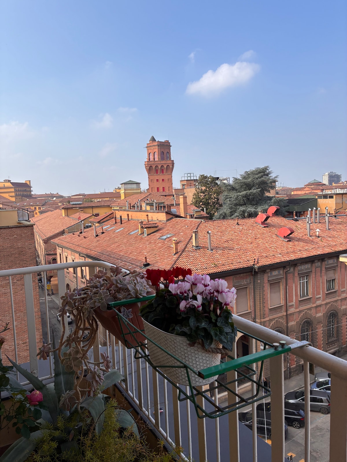 Bolonyanın tarixi mərkəzində, universitet ərazisinin sakit bir küncündə, İki Qüllədən 10 dəqiqəlik piyada məsafədə yerləşir. Liftli binanın 5-ci mərtəbəsində, sakit, Bolonya damlarının panoramik mənzərəsi ilə. 80 kvadratmetrlik mənzildə 4 nəfər yerləşə bilər və iki nəfərlik çarpayısı olan bir yataq otağı və hər birində tək çarpayı olan digər iki yataq otağı və eyvan var. Burada pulsuz Wi-Fi, iki televizor, paltaryuyan maşını olan hamam otağı təklif olunur. Tam təchiz olunmuş mətbəx, soba, mikrodalğalı soba, soyuducu və dondurucu.
