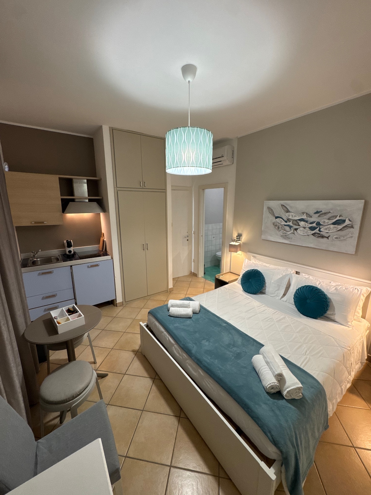 Birbaşa ön qapıdan kənarda damüstü terrasdan və pulsuz parkinqdən 180 dərəcə dəniz mənzərəli rahat çimərliyə yaxın mənzil. Kondisioner, peyk televiziyası və Wi-Fi. Mənzil sudan təxminən 50 metr məsafədə yerləşən Otranto çimərliyi ərazisində evimizdə iki mənzildən biridir. Cəmi 10 dəqiqə ərzində piyada tarixi mərkəz. Nəzərə alın ki, gəliş zamanı əlavə şəhər vergisi ödənilməlidir, hazırda bir nəfər üçün 1 avro (12-dən çox), iyul və avqust aylarında adambaşına bir gecə üçün 1,50 avro.