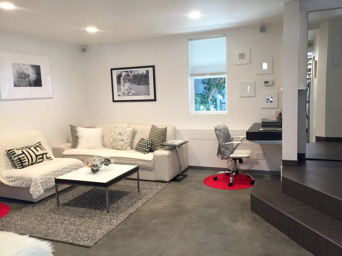 Kaliforniya sənətkarlarının evində, yamyaşıl bitkilərlə əhatə olunmuş, ayrıca girişi olan, birinci mərtəbədə yerləşən, özəl, geniş çarpayılı Qonaq Otağı. Limon ağacı və koi balıqları olan açıq verandası. Minimalist, müasir və sakitdir. Emeryvilin mərkəzində yerləşir. San-Fransisko, Berkli, Oklendə yaxın. Asan giriş | çıxış! İşgüzar səyahətçilər üçün mükəmməldir. Girinti hündürlüyü və təmiz xətləri ilə rahatlıq və minimal təsir nəzərə alınaraq dizayn edilib. PULSUZ və ASAN Küçə Parkinqi!