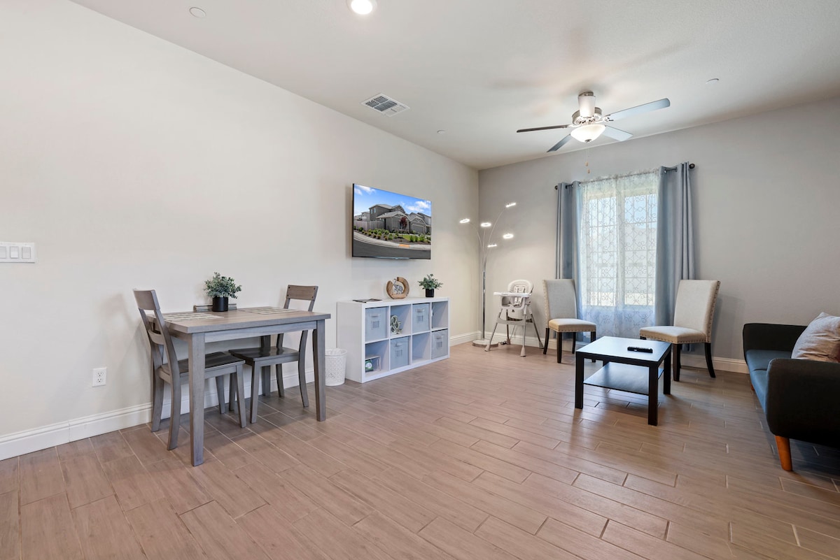 Özünüzə xüsusi girişi olan bu sakit və ayrıca qonaq otağından zövq alın. Mətbəxt mikrodalğalı soba+, bir ocaqlı konveksiya sobası, buz maşını olan tam ölçülü soyuducu və qəssab bloku olan təkərlər üzərində portativ mətbəx adası daxil olmaqla əsas ləvazimatlarla təchiz olunub. Bu mini bənzər mənzil yeni tikilmiş məhəllədə yerləşir və xüsusi park/idman kompleksinə yaxın yerdədir.