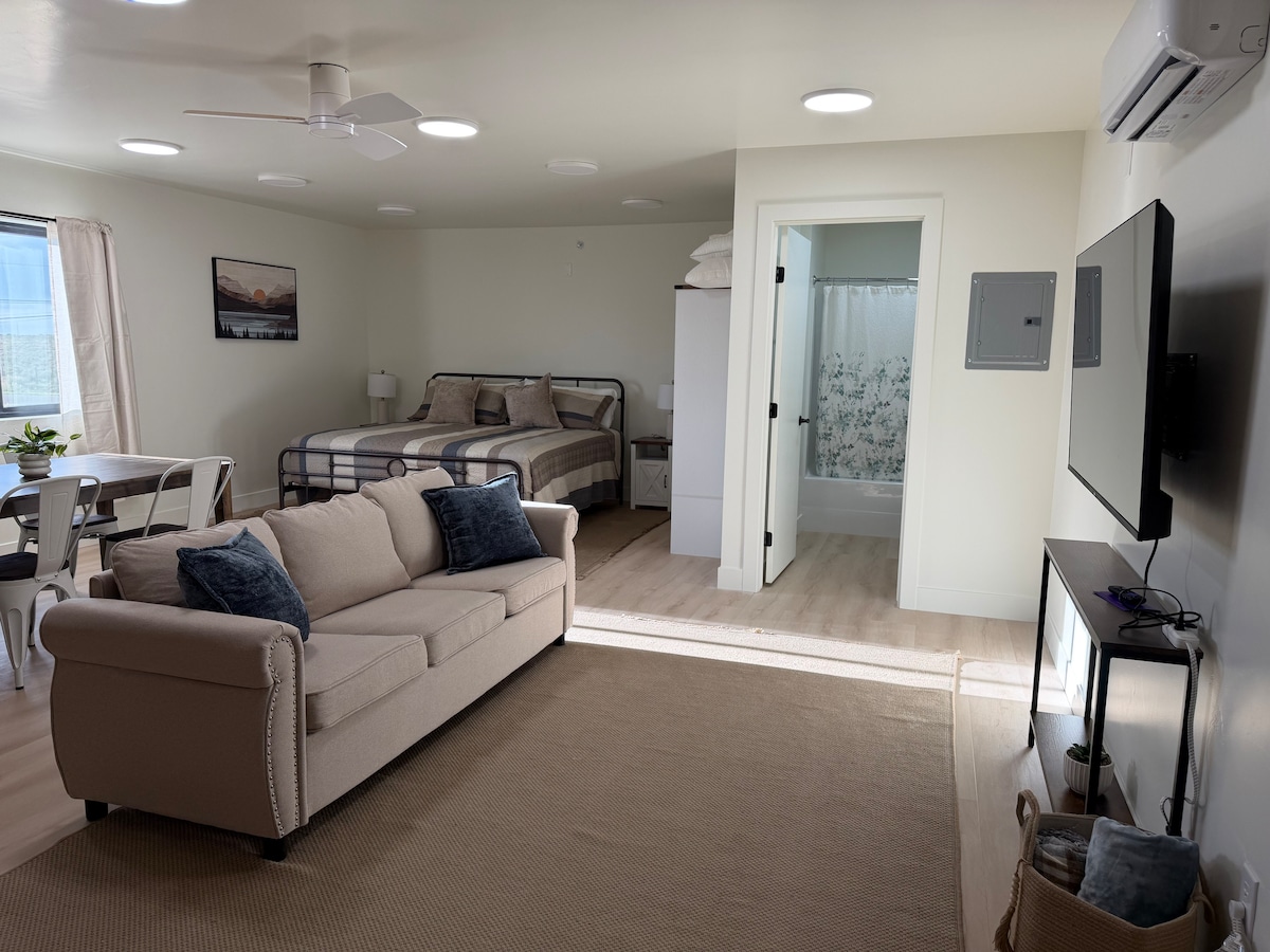 Unikal, ayrıca və geniş açıq hava məkanı olan iki yataq otağı banqalosu dəvət edirik. Yeni, rahat çarpayılar, odun sobası, artizan əl ilə hazırlanmış mebel. Yeni istilik sistemi və AC sistemi. Uzaqdan iş üçün iki xüsusi iş yeri və 1G fiber internet! Şəhərdə tapa biləcəyiniz ən çox kölgə və məxfilik. Meyvə ağaclarını tapmaqda özünüzə kömək edin, bir qamakdan olan Fabrik Butte ulduzlarından zövq alın, bəzi veranda yeməkləri üçün manqalda atəş açın və # DirtyDevilSaloon-da selfi çəkin