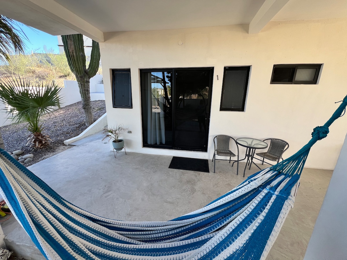 Həm rahatlıq, həm də istilik təklif etmək üçün hazırlanmış 20 m² studiya olan Fuego-ya xoş gəlmisiniz. Soyuducusu, qaz sobası/sobası və yemək barı olan tam mətbəx bir günlük sərgüzəştdən sonra yeməkləri paylaşmaq üçün idealdır. Dəbdəbəli istirahət üçün nəzərdə tutulmuş 150-179 sm-lik çarpayıda dincəlin və ayrıca hamam otağının rahatlığından və açıq havada duşa asan girişdən zövq alın. Yüksək sürətli Wi-Fi ilə asanlıqla işləyə və ya yayımlaya bilərsiniz. Çimərlik günləri, dağda velosiped sürmək və La Ventananın gecə həyatını araşdırmaq üçün mərkəzdə yerləşirsiniz. Fuego