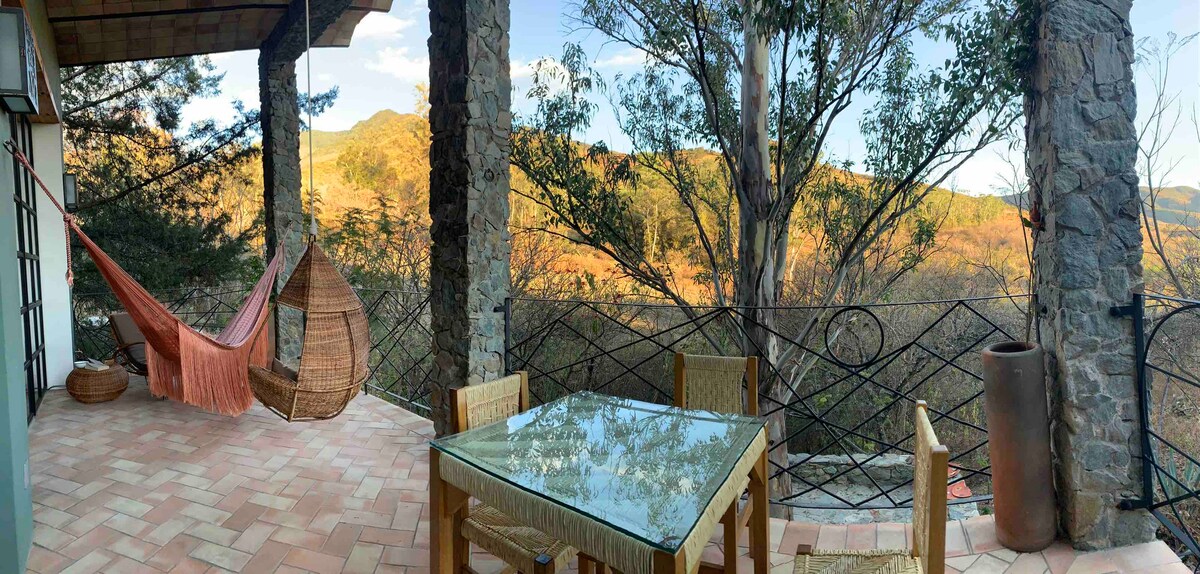 Dağa baxan sakit bir bağla əhatə olunmuş ikimərtəbəli banqalo. Alt mərtəbədə mətbəx, yemək otağı, divan-kreslo və hamam-tualetlə təchiz olunub. Yuxarı mərtəbədə kraliça böyüklüyündə çarpayı və iş yeri olan geniş divar örtüyü var. Qonaqlama sərin və yaxşı işıqlandırılır. Çöldə iki kölgəli terras və sabit üzgüçülük üçün təchiz edilmiş mini üzgüçülük hovuzu var. Oaxaka şəhərinin mərkəzindən 20 dəqiqəlik məsafədə yerləşir.