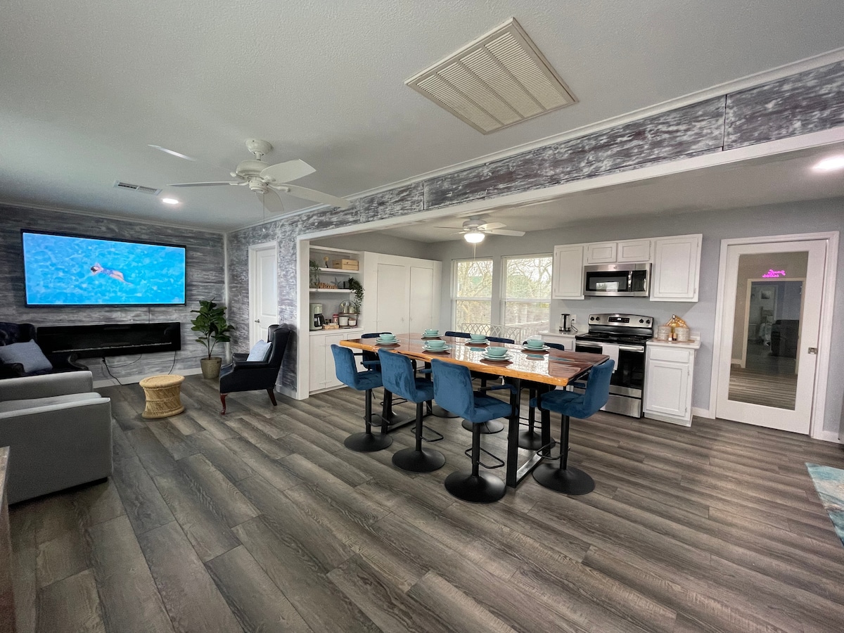 Welcome to our Gorgeous waterfront Lodge. ▪ Fully equipped kitchen. ▪ Sleeps 20 guests max. ▪ Main bedrooms with Roku TVs, private bathrooms, and Galveston Bay views. ▪ bunk room with TV & full bathroom for the kids. ▪ Game room with a pool table and dart boards. ▪ Fish off the 300-ft pier. We offer combo listings that allows guests to exclusively enjoy the private pier. When booked separately, the pier is shared among two houses. But the pool is exclusively for The Lodge guests
