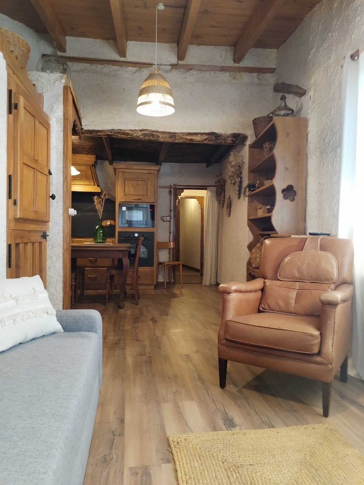 Este alojamiento único tiene mucho espacio para que disfrutes con los tuyos. Dispone de una amplia zona de estar para disfrutar en familia o con amigos y podrás relajarte en su terraza con vistas a la montaña. Consta de una habitación con cama de 1,50 con almohada de aloevera, un baño grande con ducha, cocina con menaje de cocina, nevera, horno, microondas, tostadora, cafetera, etc, y zona de estar abierta, un sofá que se convierte en cama y un altillo con dos confortables camas de 90 cada una.
