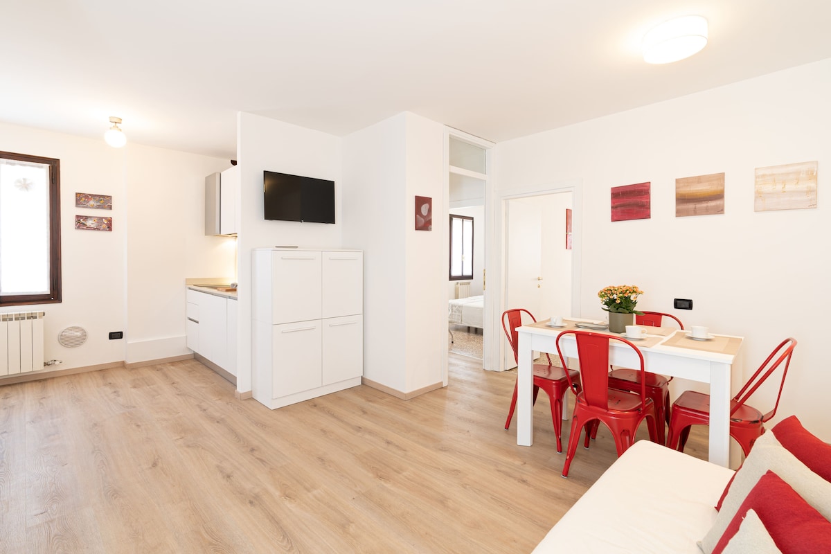 Fully renovated apartment in 2021, easy to reach and ideally located for those wishing to visit the Biennale. It features a private entrance, a fully equipped kitchen, a bathroom with shower, a bedroom, and a spacious living room with a sofa bed. It is located just a few steps from a typically Venetian commercial area, where you will find various shops mainly frequented by locals. It is the ideal starting point for exploring the city.