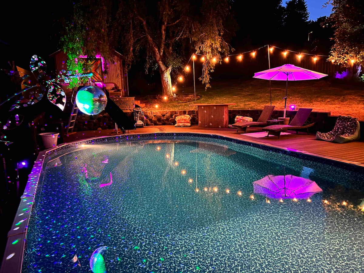 Modern Scandi Guest Suite located on a 1/3 of an acre within the Powell Butte Natural Area. Equipped with a Heated Pool, Oversized Hot Tub Spa, Water Slide, Outdoor Shower, & plenty of privacy and room for activities. A grand sculpture arches over the large pool displaying a gorgeous disco ball! It is the perfect feature to swim under or use as a backdrop for a unique photo. The large deck and pool get full sun almost all day. This space boasts total privacy and all the amenities!