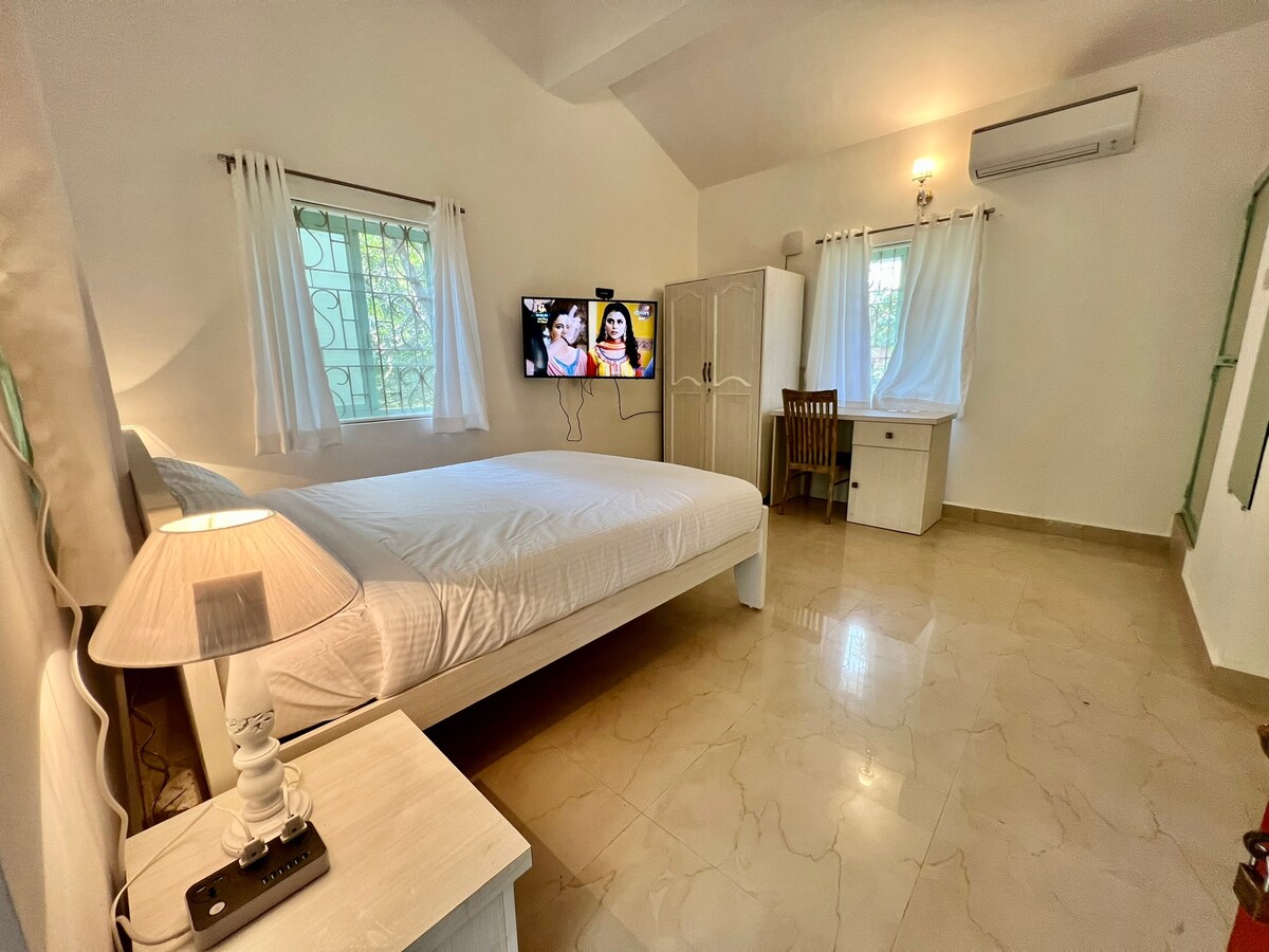 Müasir Boho Mənzili | Şimali Qoa çimərliklərindən bir neçə dəqiqəlik məsafədə. Birinci mərtəbədə yerləşən, cütlüklər, dostlar və ya kiçik ailələr üçün mükəmməl olan, tam mebellə təchiz olunmuş, rahat bir 1BHK istirahət məkanı. Əsas xüsusiyyətlər: - İstilik verən üslublu Boho interyerləri - Rahatlıq üçün yataq və qonaq otağında kondisioner - Ağıllı TV + Yüksək sürətli Wi-Fi - RO suyu, aşpaz, soyuducu və paltaryuyan maşınla təchiz olunmuş mətbəx - Paylaşılan üzgüçülük hovuzu (9 AM-6 PM | üzgüçülük geyimləri məcburidir - Gündə adambaşına 200 INR məbləğində yerli idman zalı mövcuddur - 24/7 təhlükəsizlik - Pulsuz Parkinq