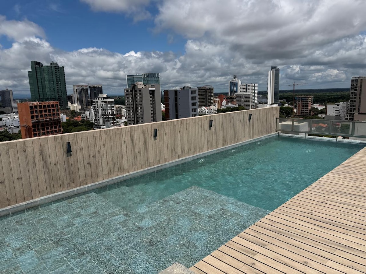 Santa Kruzdakı ən hündür airbnb-də və şəhərin ən yaxşı binasında qonaqlamanızdan zövq alın. Piscina, Sauna a Vapor, 26-cı mərtəbədən gözəl Manzana 40 binasına, ekoloji kordonun təbiətinə və uruboya doğru möhtəşəm mənzərələrdən zövq ala bilərsiniz. Supermarket, restoran, ticarət mərkəzi, biznes mərkəzi, banklar, SPA-dan bir neçə addım. Binada Santa Kruz , Cielo skay barı və Asiyada Jardinin ən hündür və gözəl restoranları var.