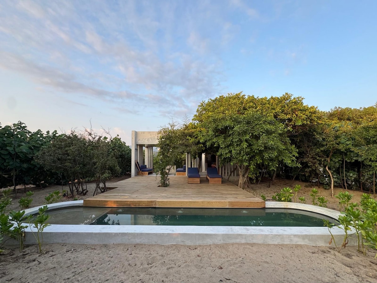 Oaxaka ştatının Puerto Eskondido şəhərində Memar Alberto Kalaç tərəfindən dizayn edilmiş dəniz kənarında möhtəşəm və ekoloji evcik. Dünya ilə əlaqəni kəsmək və təbiətə heyran olmaq üçün dənizin qarşısında bağ. Cütlük, ailə və ya dostlarla birlikdə zövq almaq istəyən təbiət sevənlər üçün mükəmməldir. Yaxınlıqdakı Kasa Vabi və Laquna de Manialtepek şəhərlərini ziyarət edə bilərsiniz.