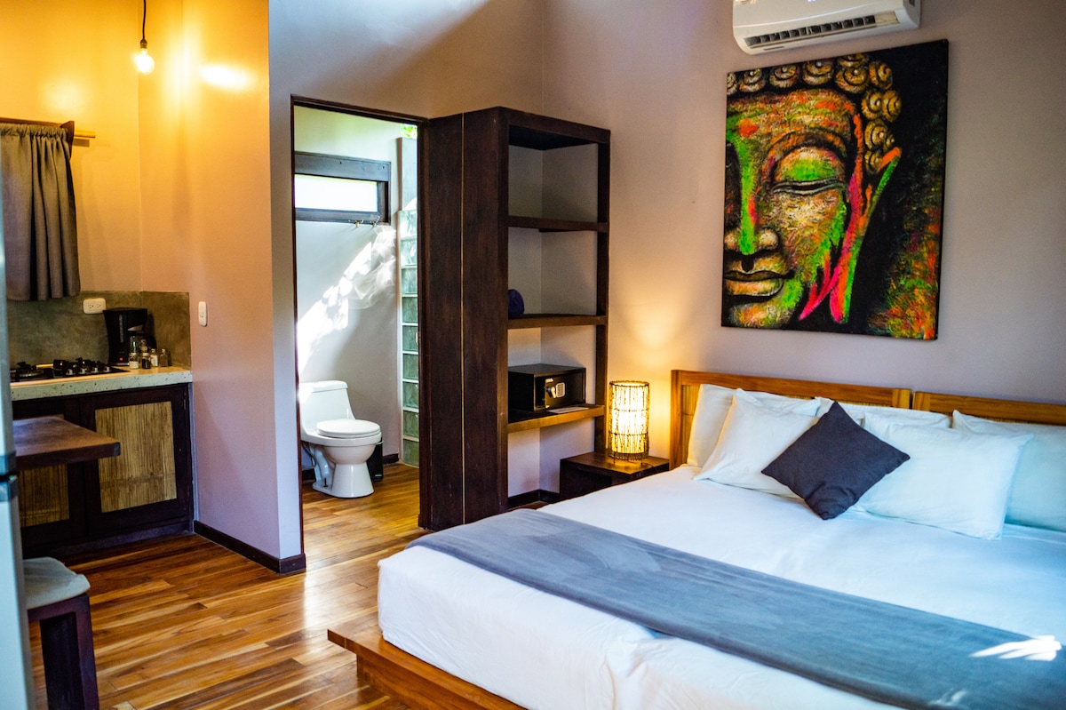 This superb villa was design ideally for couples or solo travelers that want 100% privacy and maximum confort, while enjoying the majestic view of the garden and pool. This villa includes king size bed, fully equipped kitchen, Ac, private bathroom, and a large deck with a big sofa ideal to relax after a good surf.