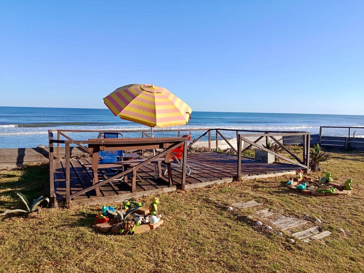 Casa pé na areia com deck privativo com escada a beira mar, sacada ampla inferior e superior, deck com bancos, espreguicadeiras e rede. Forno e fogão a lenha, além de churrasqueira tipo parrijeira e lareira. Cozinha completa. Peças amplas e arejadas. Colchões com capas higienizáveis. Um paraíso para festejar com amigos e familia. Tem pranchas, morey e bicicleta. A noite do deck superior se pode ver a iluminação do farol do Chuí, que divide Brasil e Uruguai.