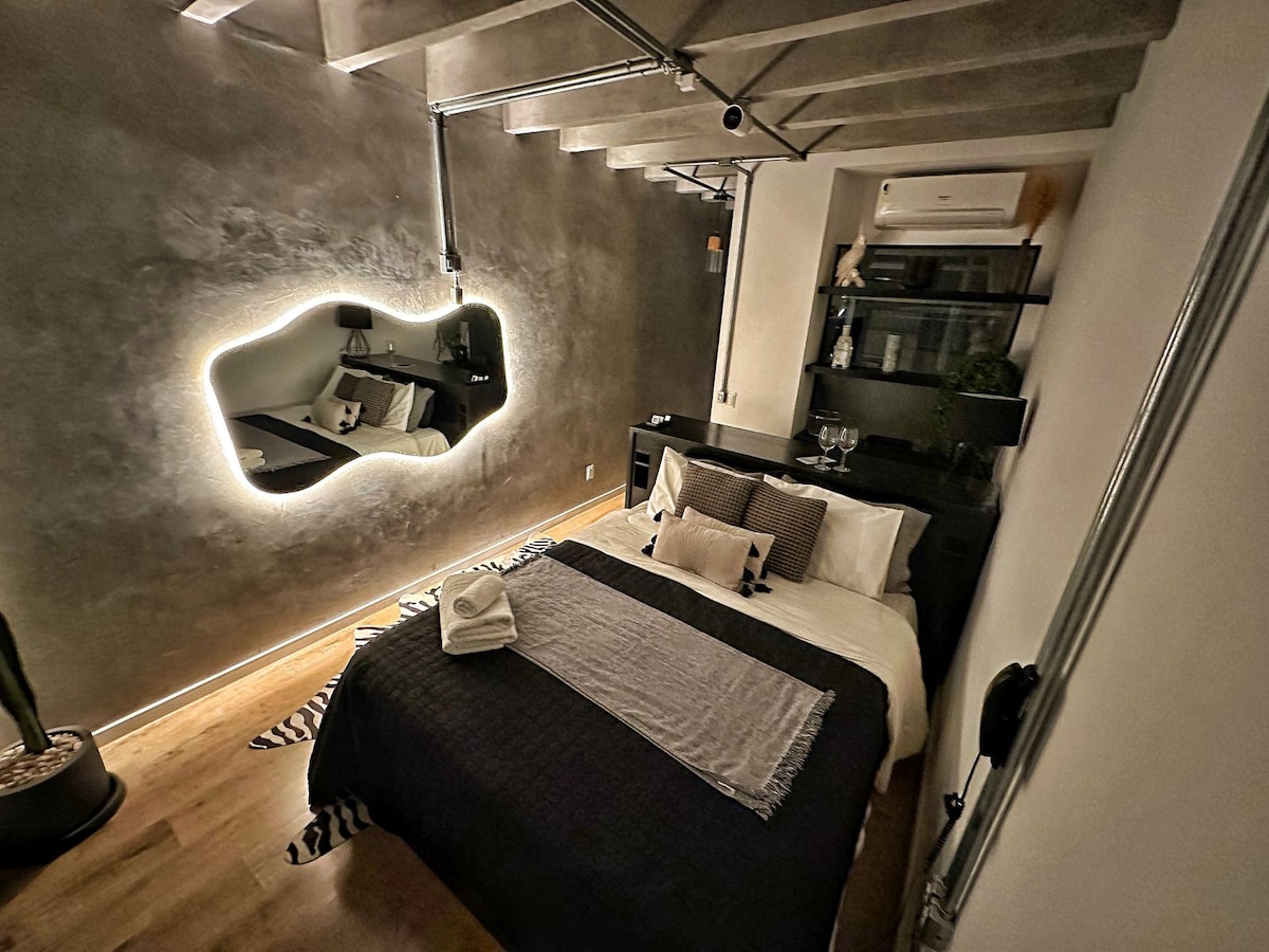 Müasir studiya, tam təchiz olunmuş mətbəx, 75 düym televizor və Wi-Fi