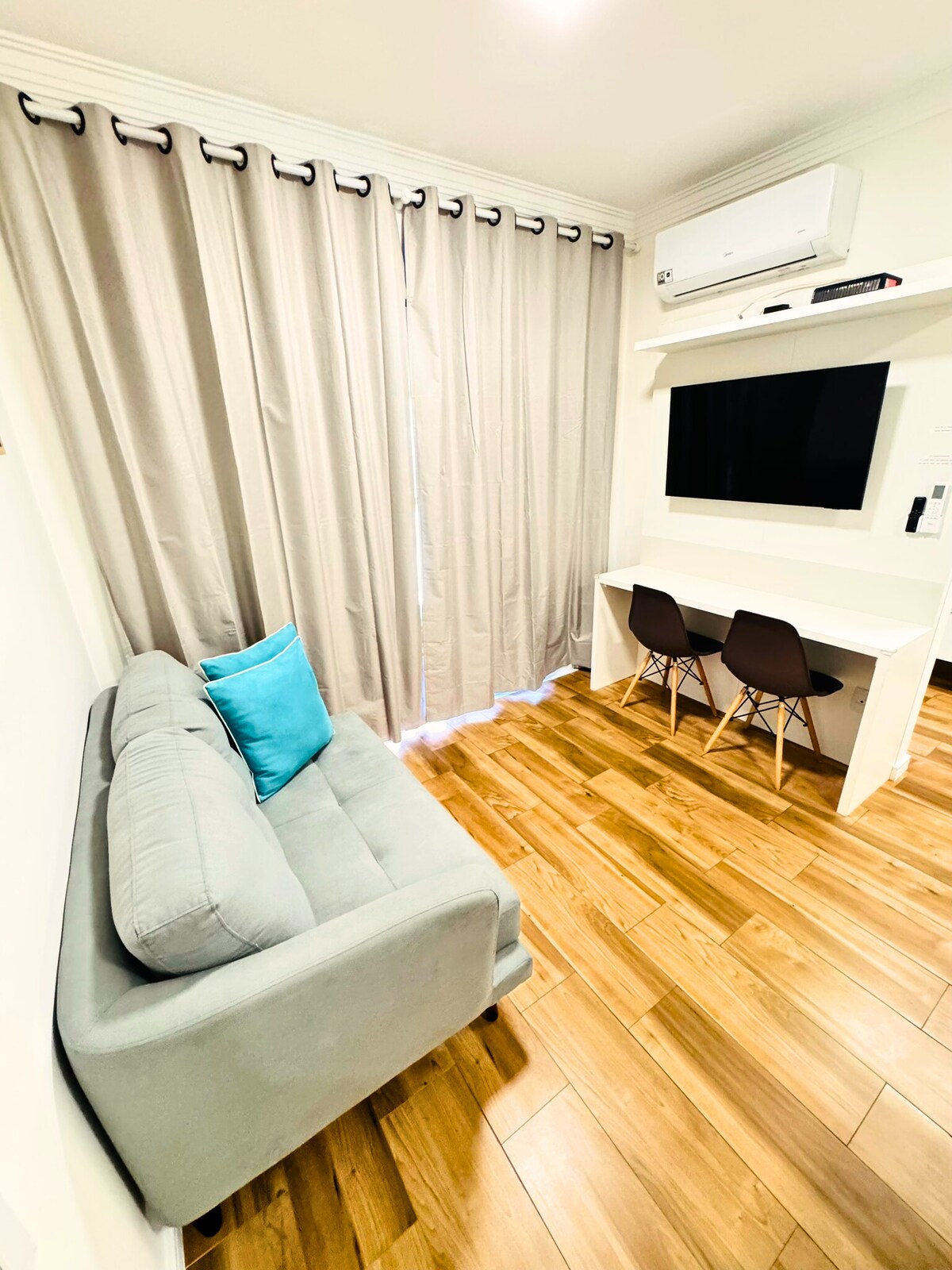 Kraliça çarpayısı olan bir yataq otağı və 1 böyük və bir uşaq üçün divan çarpayısı olan qonaq otağı, masa və stul və televizor Samsung 55", minibarlı mətbəx, mikro dalğalar, soba, elektrik sobası, Keurig qəhvə maşını, qazanlar, metal formalar və mətbəx ləvazimatları olan mənzil. Rahatlığınız və komfortunuz üçün LG paltaryuyan maşını və quruducusu. Saç feni və sörf taxtası Revlon. Damüstü hovuzda, quru saunada, duş və hovuz masası olan salonda. Valet parkinqi. Gündəlik otel xidməti.